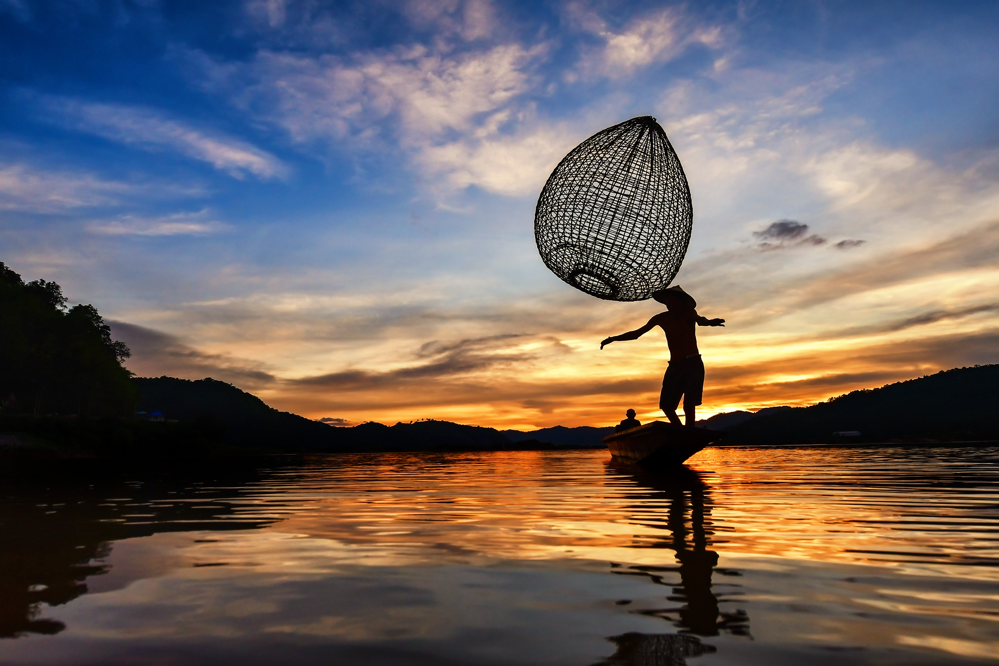 Created with images by • sirisakboakaew - Mekong river fish sunset • Travel Wild - Stunning aerial view of a tourists boat sailing along the Mekong river at sunset in Luang Prabang, Laos.