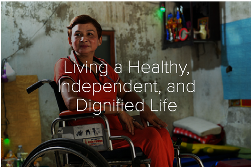 which provides direct support to persons with disabilities and caregivers in independent living skills, reproductive health, legal counseling, and gender-based violence workshops. Initially, Ms. Loa spent time in a transition house where she learned how to use accessibility features so that her own home could be modified, allowing her to live a more independent, healthy, and dignified life. Following this, she participated in workshops where she learned to care for herself and improve her self-worth. One of the most apparent changes came when she was provided with a wheelchair, which she was initially hesitant to use, but over time she took to the wheelchair like a pro. It has revolutionized her life. She used to leave the house only to collect recycling left nearby, but now she’s active in her community, she goes to the market, buys healthy food, and cooks in her accessible kitchen.