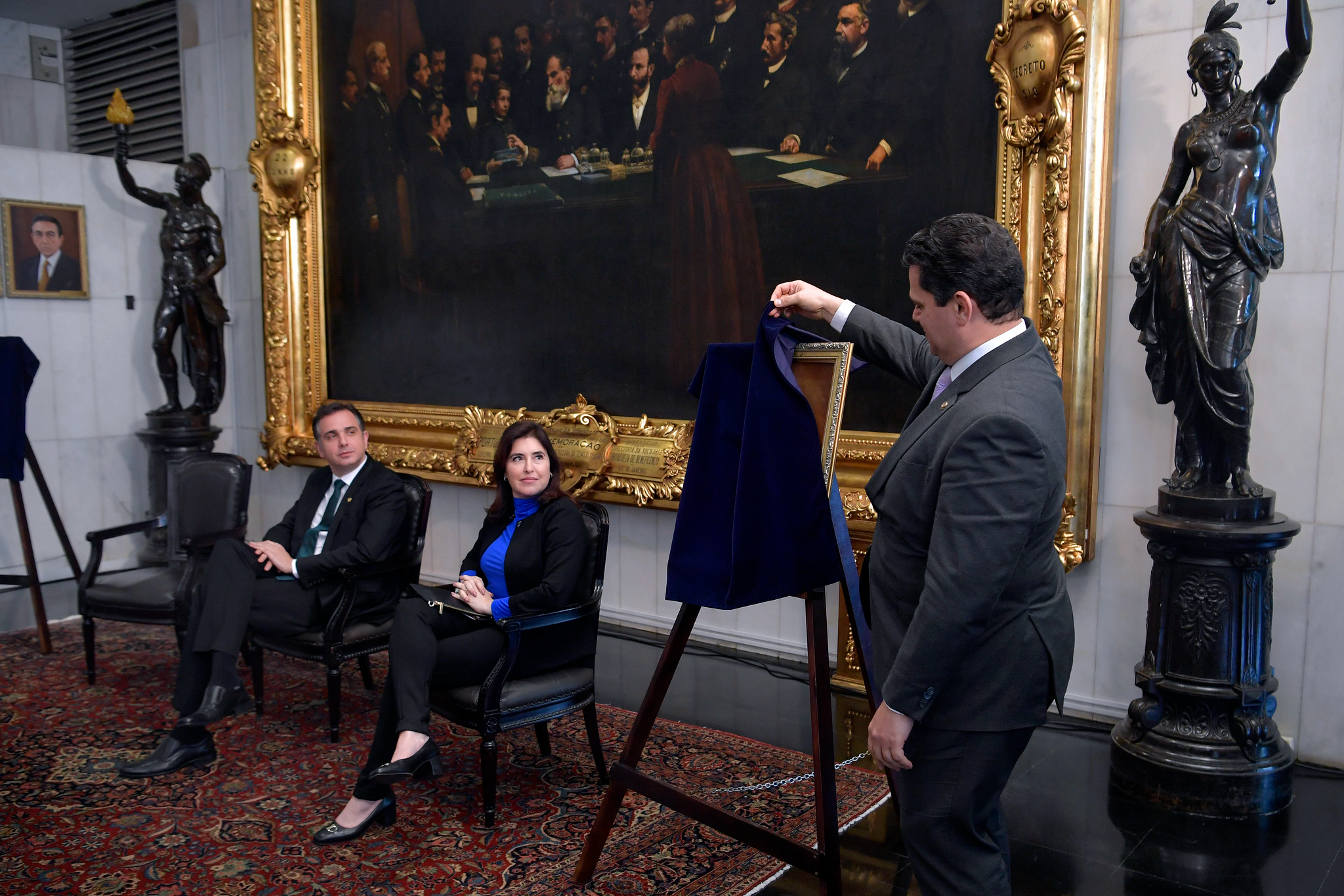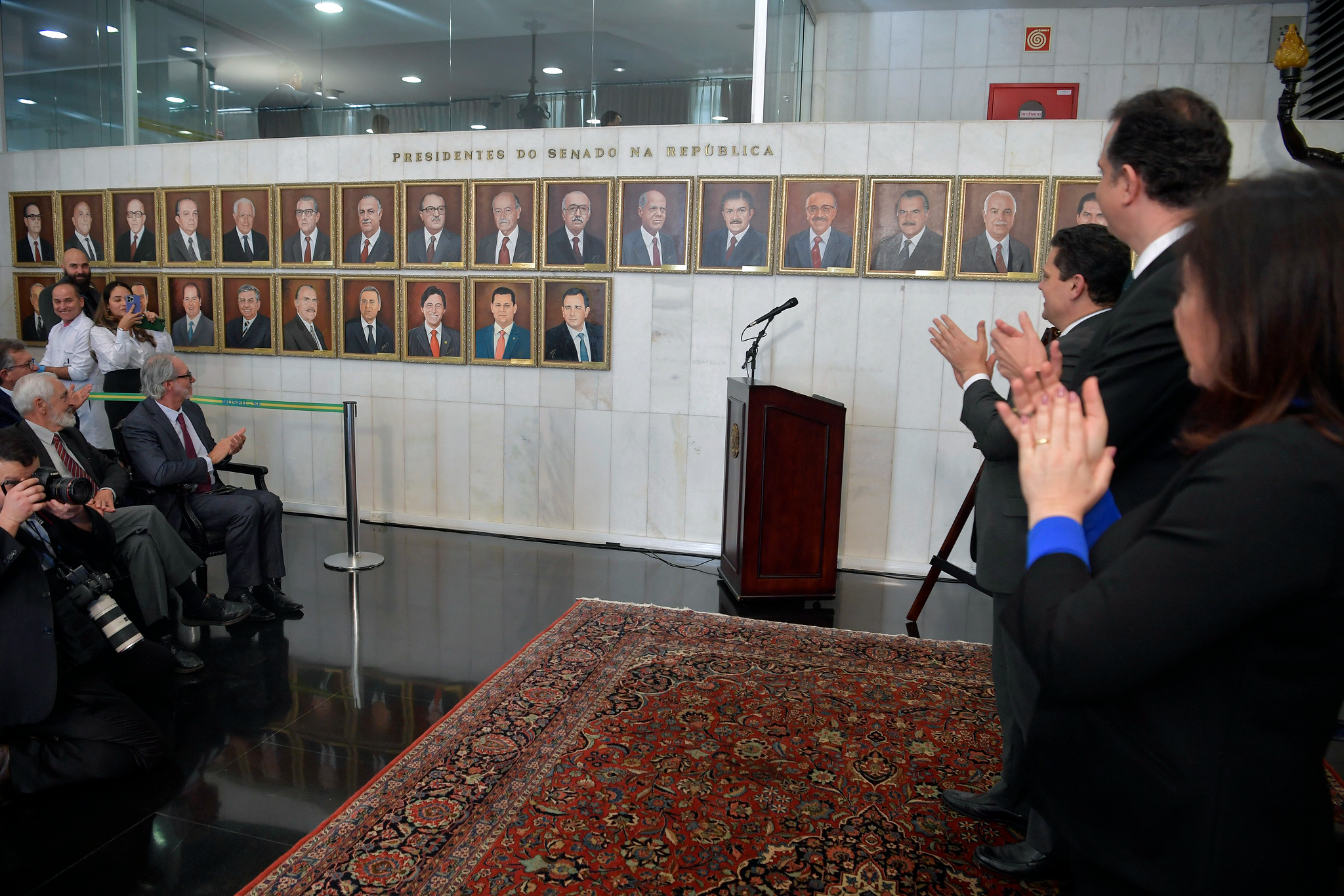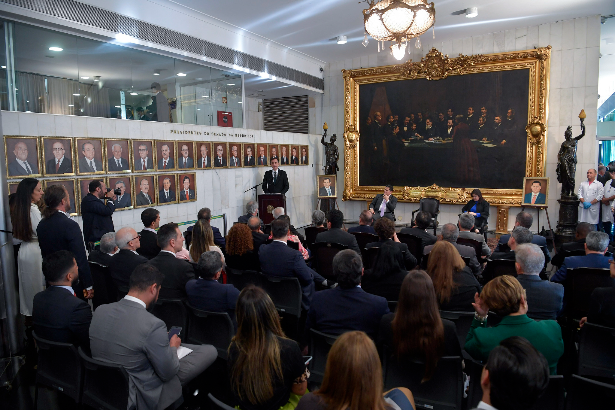 — Hoje fazemos a aposição dos quadros dos presidentes da 56º legislatura, o senador Davi Alcolumbre e eu, e reintegramos as obras danificadas nos atos criminosos de vandalismo e de aviltamento da democracia. Assim, esta Casa reafirma o compromisso com a democracia e com a memória social e política do Brasil. Nossa Biblioteca, nosso Museu, nossos avançados sistemas de registro digital, compõem um sofisticado conjunto de iniciativas para garantir a este acervo segurança, transparência e acesso — afirmou o presidente.