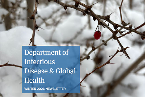 Dear All,  Every now and then something comes up that marks the passage of time in a way that is slightly different than the calendar on the wall. I recently had a chance to reflect on that as my 5 year term as Chair of our Department of Infectious Disease and Global Health is up for renewal. There is no doubt that we are in a much different place than we were when I initially stepped in as interim at the outset of the COVID-19 pandemic and I have no doubt we’ll be in a different place five years from now. It is also clear that the decisions and actions we take that are under our control will play a strong role in charting the path we take. This is already playing out in the changes we see about the campus both physically and in the work we do. As part of the campus plans, some of our department, including Allen Rutberg and his team have migrated across campus to the Admin building and we’ll soon be seeing signs of the new classroom building’s impending construction - hopefully a harbinger of things to come. Read more in the newsletter below about the latest department work in research, teaching and service that are carrying us forward. I also hope everyone has enjoyed the winter weather we’ve had if you like to partake in winter activities. The holiday party back in December was a great way to celebrate and kick into winter mode. If you’re pining for Spring, take heart that time will continue to fly and I look forward to seeing you all at our Spring picnic and in between now and then. Cheers,  Jon