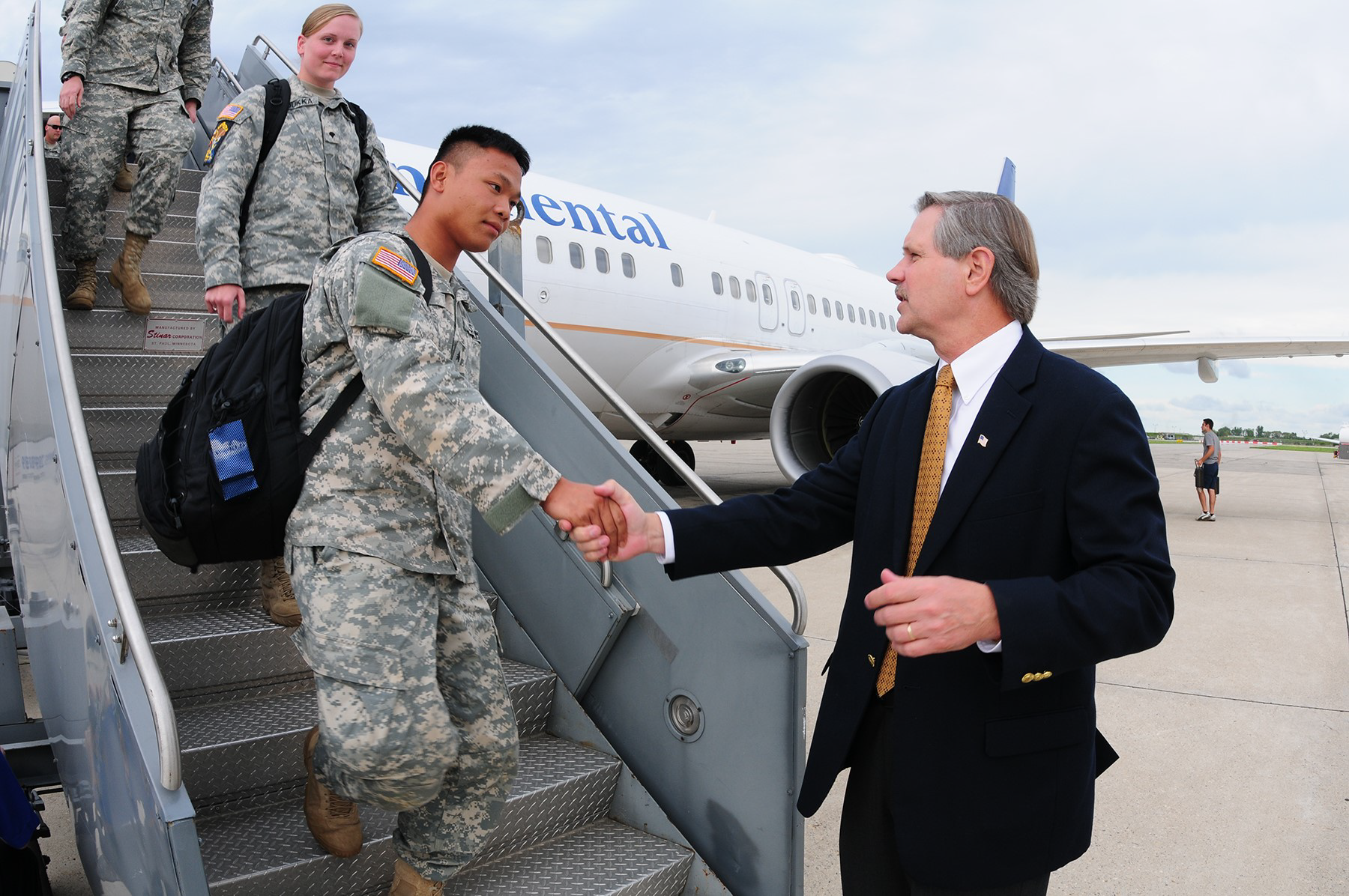 Photo: Governor John Hoeven congratulates Staff Sgt. James Jennen, 119th Communications Flight, during the Hometown Heroes Salute ceremony at the North Dakota Air National Guard base, Fargo, Sept. 11, 2010.