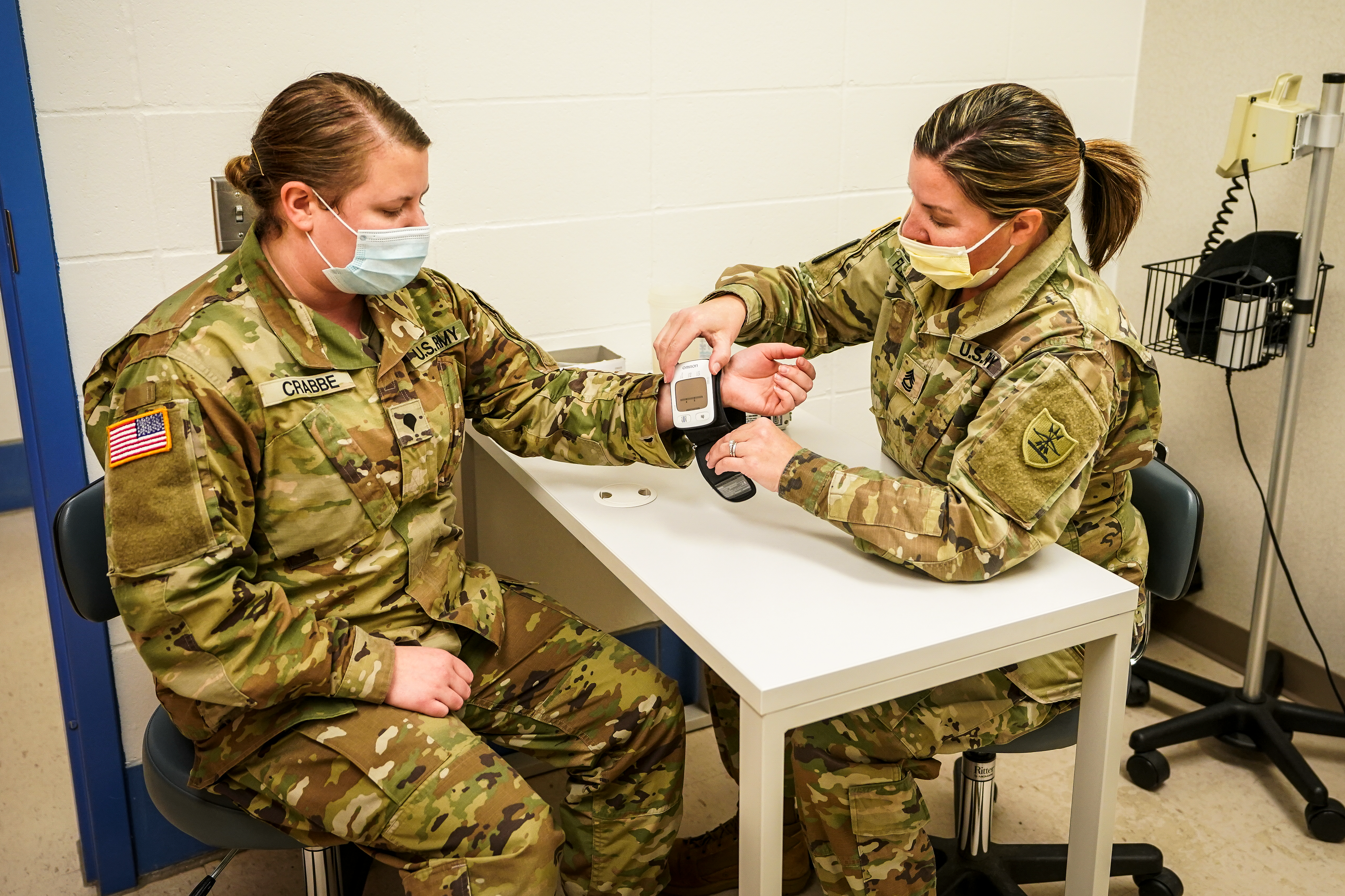 Sergeant First Class Jodell Fleckenstein, Medical Readiness Detachment, places a blood pressure reporting device on Spc. Samantha's Crabbe's arm, Raymond J. Bohn armory, Bismarck, Jan. 11, 2022.