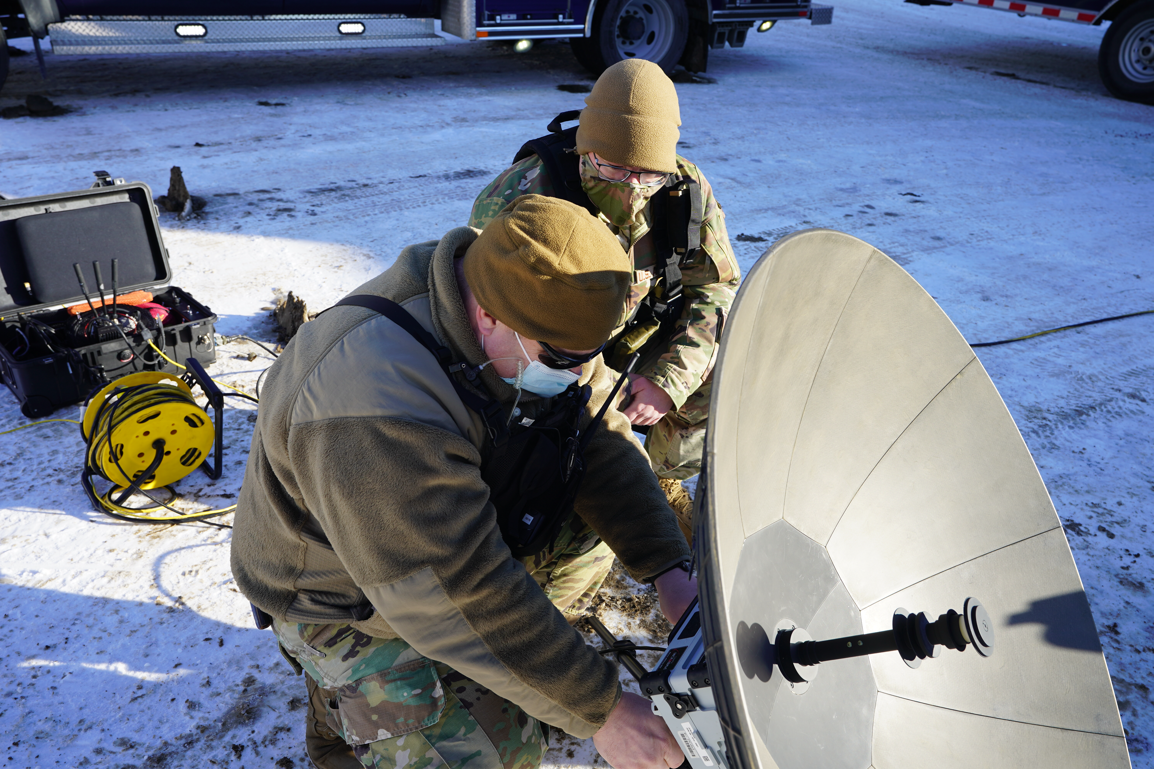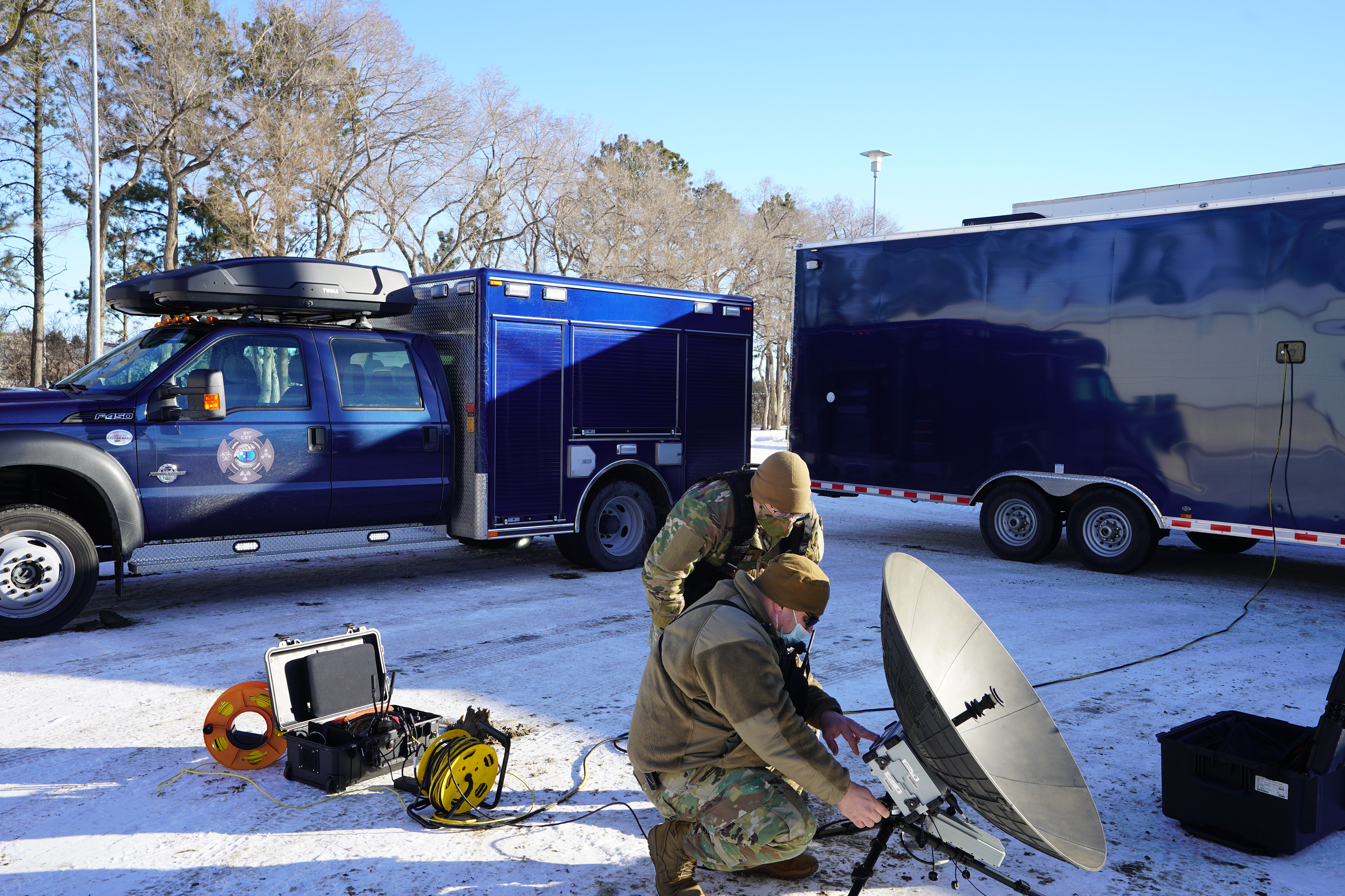 Sergeant 1st Class Bill Miller, left, and TSgt. Sam Hemphill, both of the 81st Civil Support Team, set up a satellite for secure network training at the N.D. Department of Health State Laboratory, Bismarck, N.D., Jan. 11, 2022. This network is essential for securing sharing information between incident site and the N.D. National Guard's Joint Operation Center at Fraine Barracks.