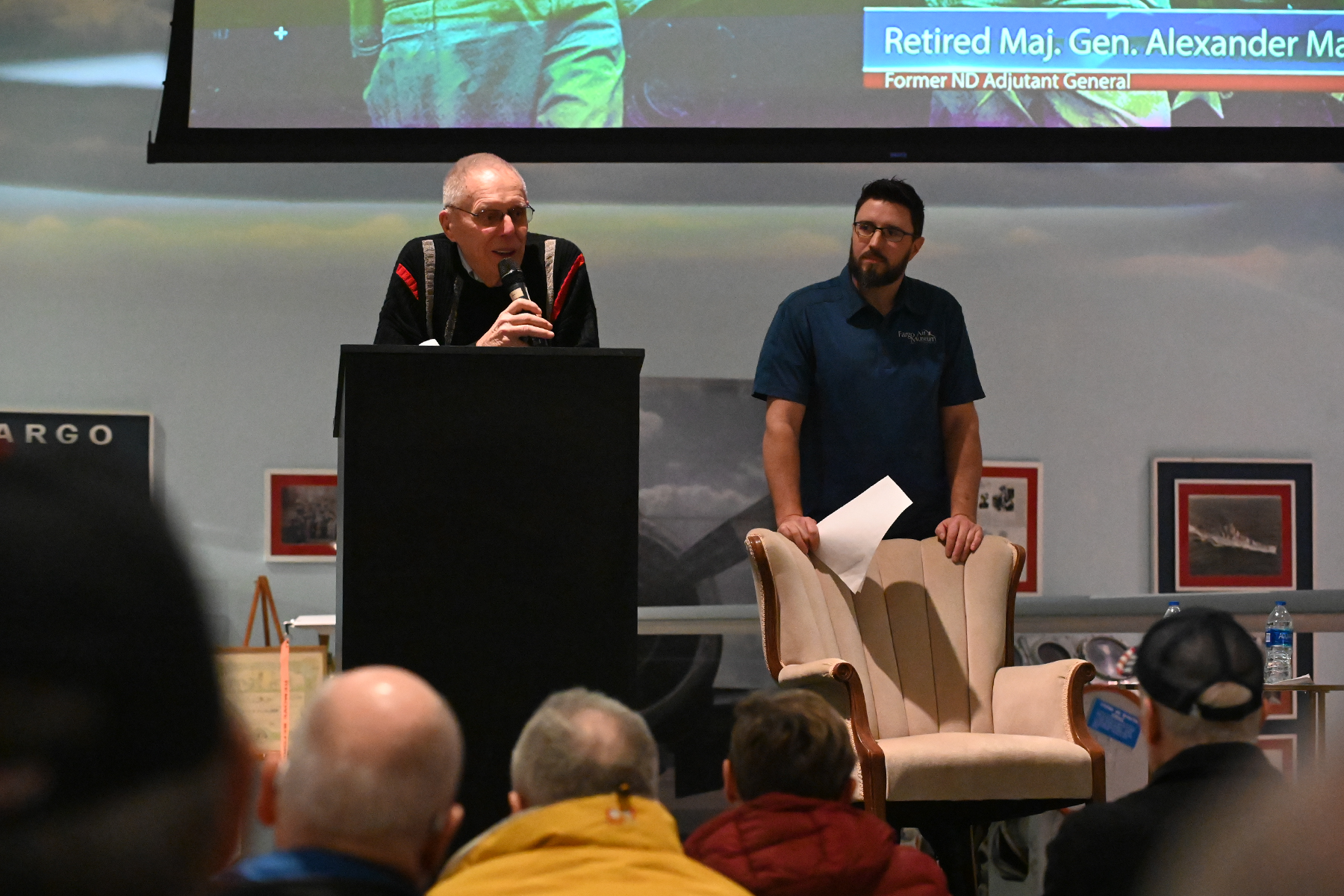Photo: Retired Major General Alexander Macdonald, speaks about his Korean War experiences as Ryan Thayer, Fargo Air Museum executive director, looks on, Jan. 18.