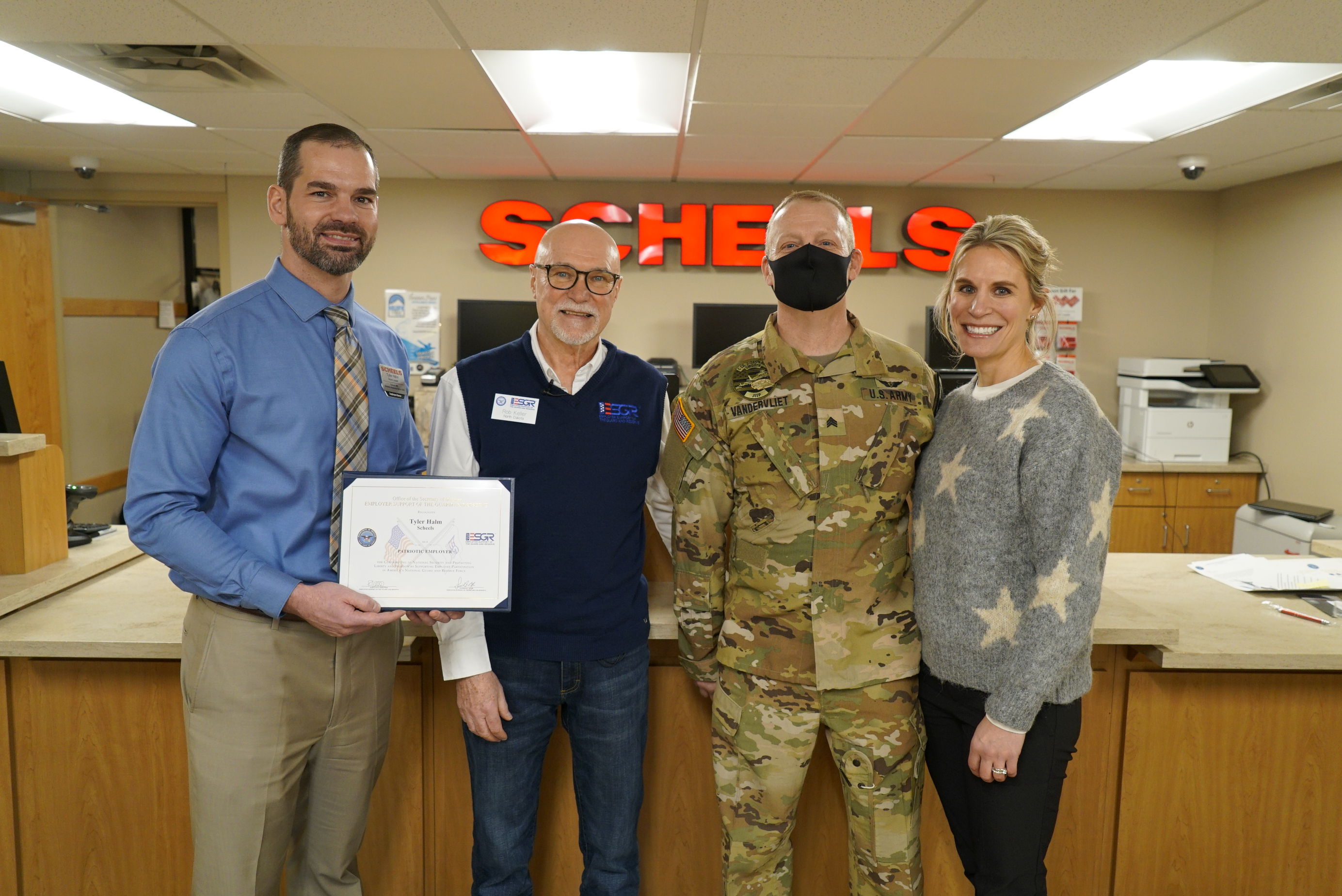 From left, Tyler Halm, Scheels' Bismarck store manager, Rob Keller, ESGR public affairs director for North Dakota, Sgt. Joey Vandervliet, Company C, 2nd Battalion, 285th Aviation Regiment, and Vandevliet's wife, pose with the ESGR Patriot Award, Bismarck, N.D., Jan. 20, 2022.