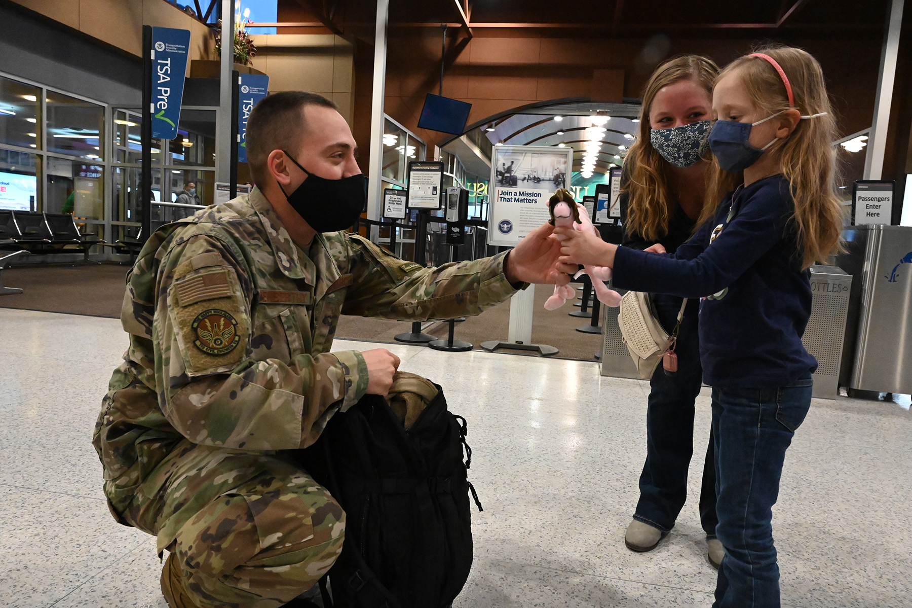 Top: Master Sergeant Coltyn Penberthy, 119th Civil Engineer Squadron, presents a gift to his daughter as his wife looks on at Hector International Airport, Fargo, N.D., Jan. 15, 2022. Penberthy returned home after completing a six-month deployment to Africa. (National Guard photo by David H. Lipp)