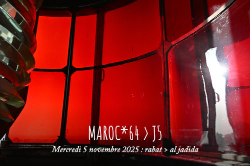 Al Jadida, N° 8 : l'on finit en beauté et à la nuit avec ce phare de Sidi Bouafi, découvert après bien de difficulté il y a 2 ans déjà. Personne dans la cour, les drapeaux flottent dans le ciel crépusculaire, deux jeunes filles sortent d'une maison. Je m'explique, rien à faire, non l'on ne peut pas monter. Le papa de l'une d'elle n'est autre que le gardien qui est en train, tout là-haut, de contrôler l'allumage. Sitôt redescendu il me reconnaît et nous voilà de nouveau à grimper dans ce beau et grand phare. Instant de chance, de baraka, la pleine lune dont c'est le jour, illumine la ville et le marabout en contrebas. C'est absolument féérique. L'on ne voudrait jamais descendre. Flanquées de Hiba et Salma, prévenantes, armées de téléphones allumés afin de nous éclairer, nous revoici au pied de la tour. Une amie, Fatima-Zahra, arrive, joliment habillée pour les festivités de la marche verte, séance photos, échanges des N° de téléphones, nous reviendrons c'est certain. Quel chaleureux accueil.