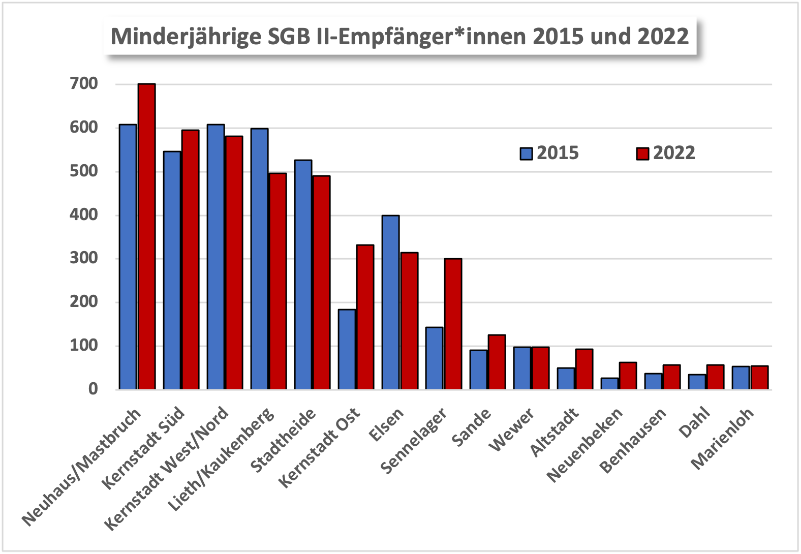 Jede*r Fünfte dieser Altersgruppe (19,7 %) ist SGB-II-Empfänger. Im Sozialraum VII Neuhaus/Mastbruch betrifft das 2022 etwa 700 Kinder und Jugendliche. Im Sozialraum VI Lieth/Kaukenberg sind es 25,7 %, in Sennelager 23,4 % der Altersgruppe.