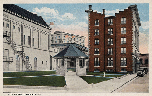 Background Image: Postcard of the Durham Rotary Club Bandstand in the original Rotary Park in 1916