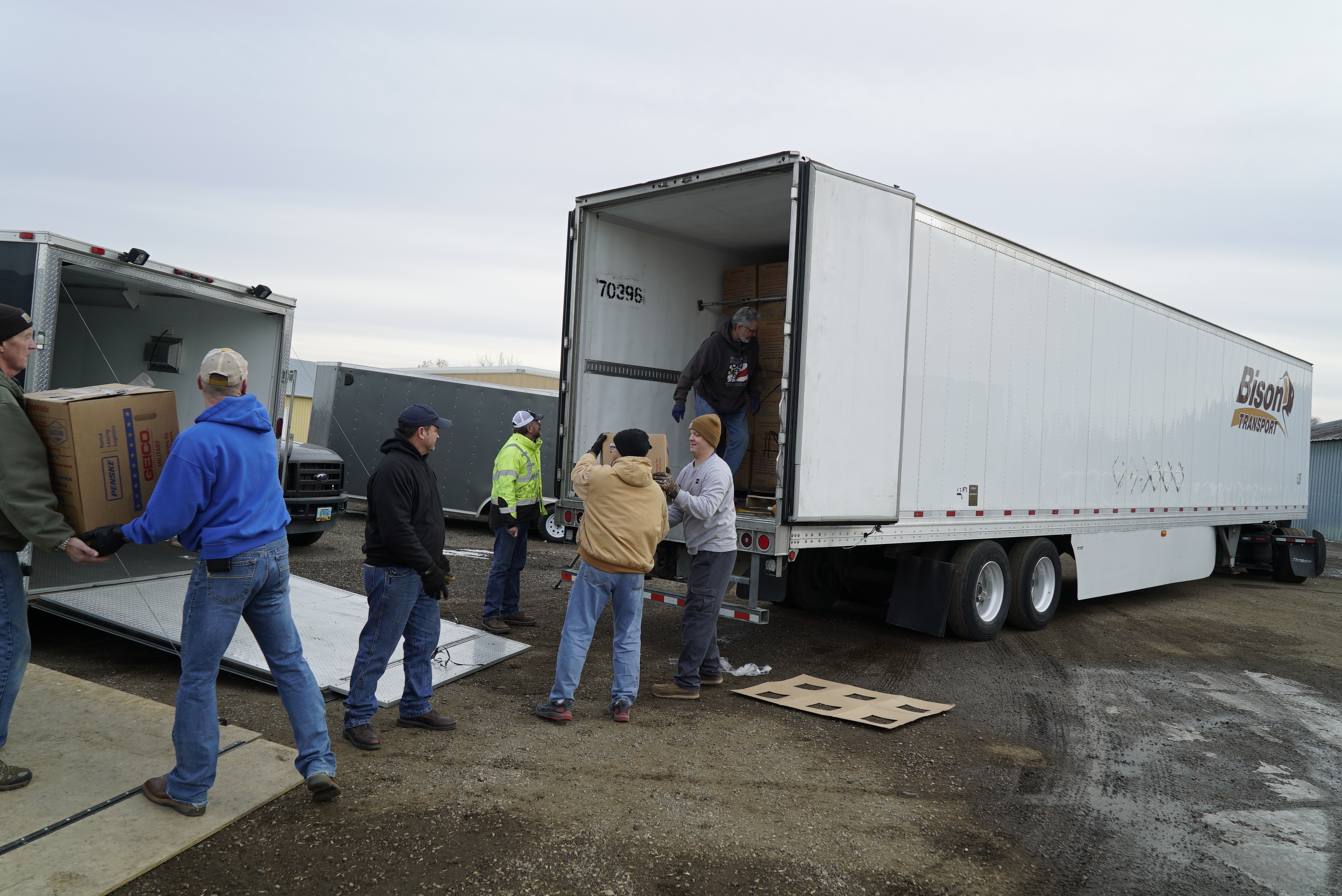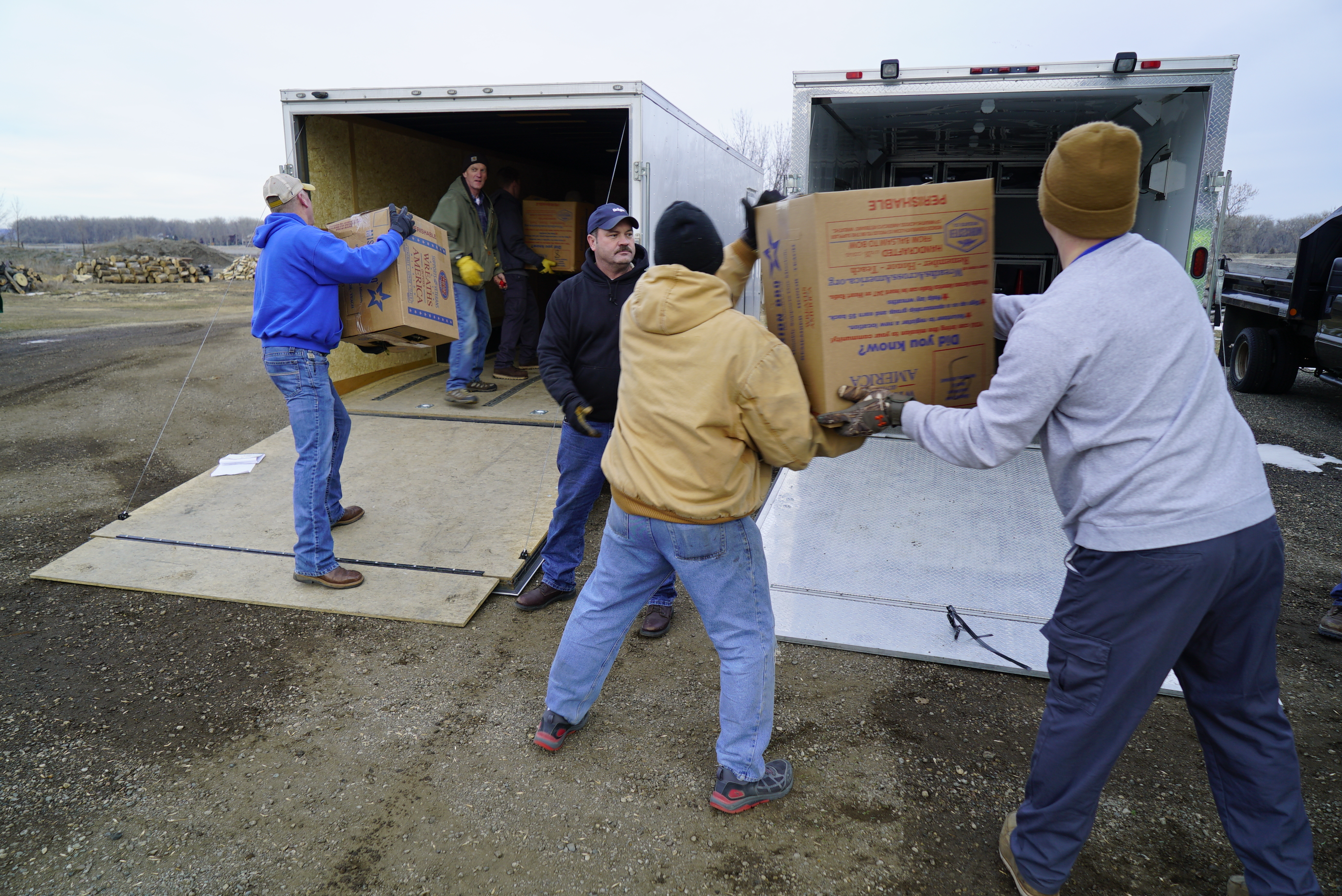 About 7,700 wreaths arrived on two semi-tractor trailers this week. The wreaths were transferred to smaller trailers and will be transported to the N.D. Veterans Cemetery on the day of the event.