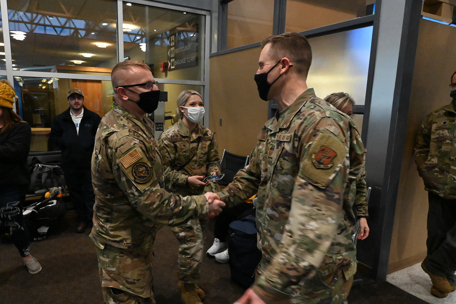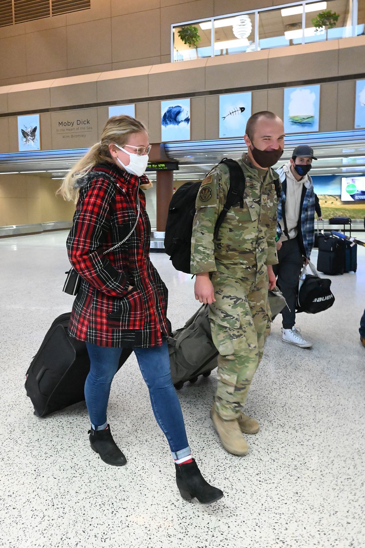 Happy Hooligans Staff Sgt. Calvin Nordsletten and Tech. Sgt. Andrew Rohrich were greeted by friends and family as they returned home to Hector International Airport, Fargo, N.D., Dec. 15, 2021. (National Guard story and photos by Chief Master Sgt. David Lipp, 119th Wing)
