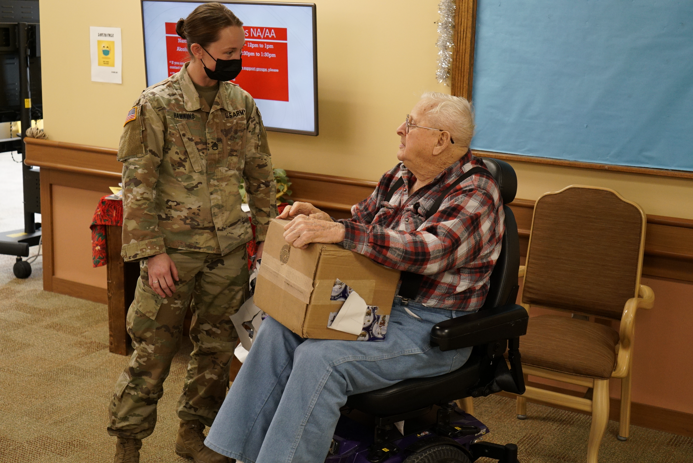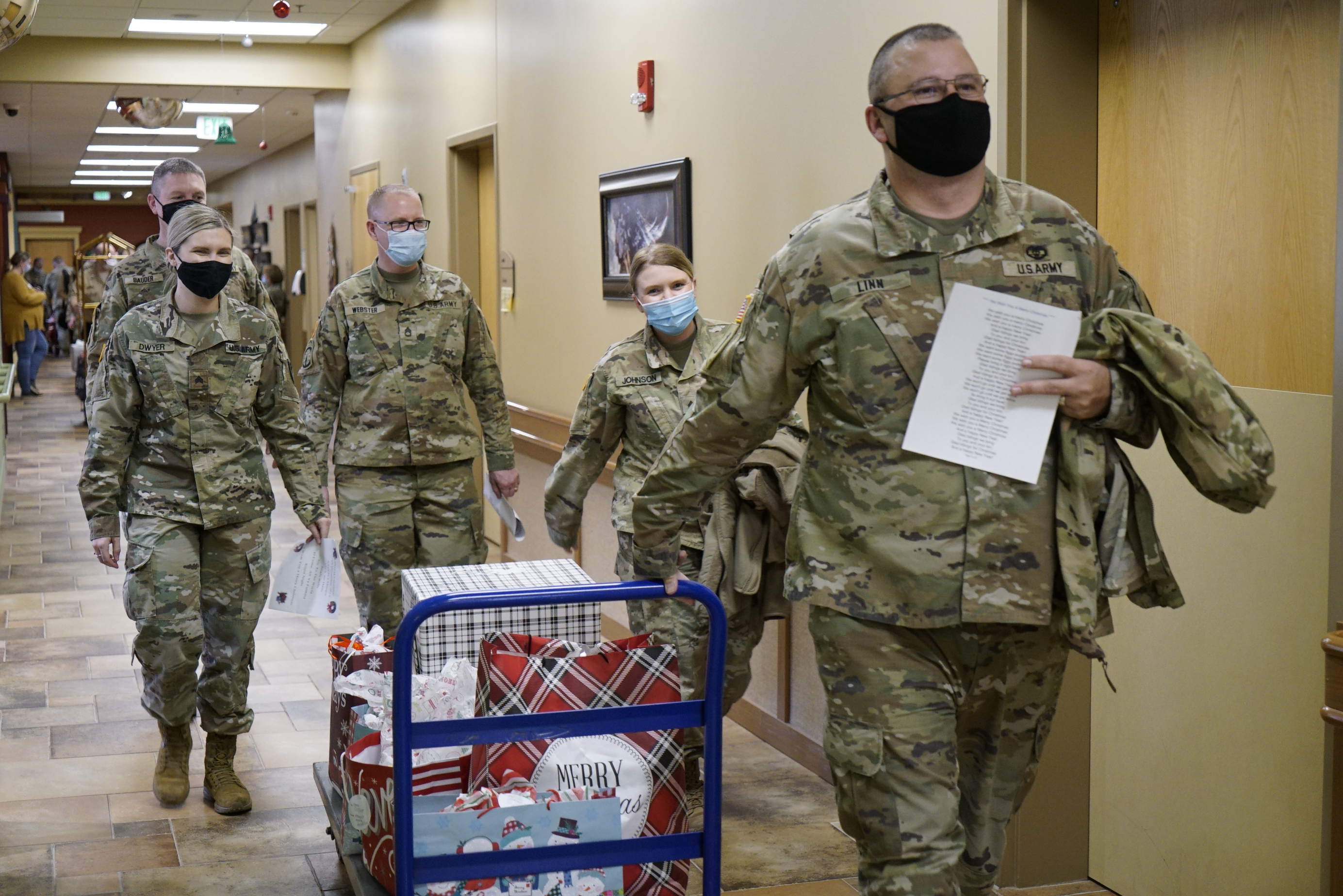 This annual responsibility rotates between the N.D. Army National Guard and Air National Guard components. Service members sang Christmas carols, talked, and assisted residents in opening their gifts.