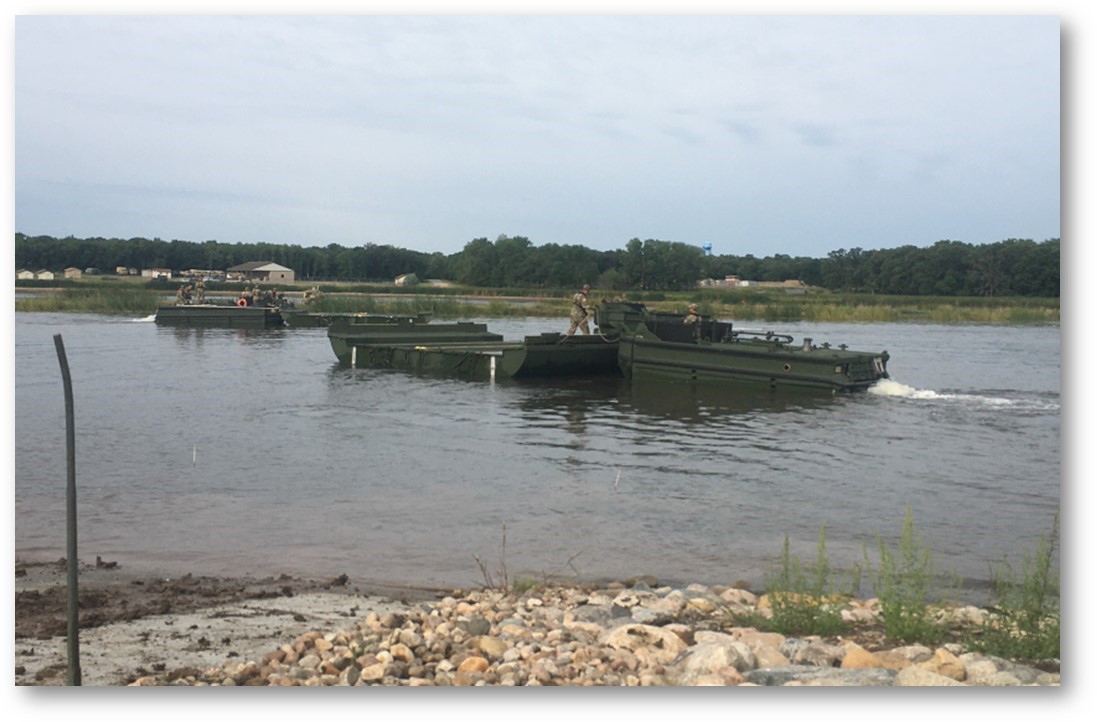 The construction of a bridge park at Camp Grafton Training Center (CGTC) provides a convenient training site for Soldiers to train on all bridges in the U.S. Army inventory. The first bridge boat was launched in July 2020, upon completion of Phase I of the project. Phase II will expand the maneuver space. (National Guard story by retired Lt. Col. Shirley J. Olgeirson, N.D. National Guard historian)