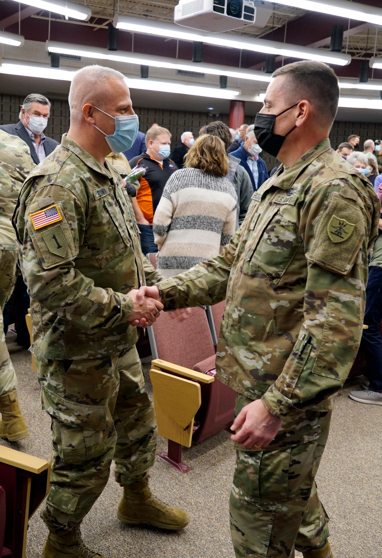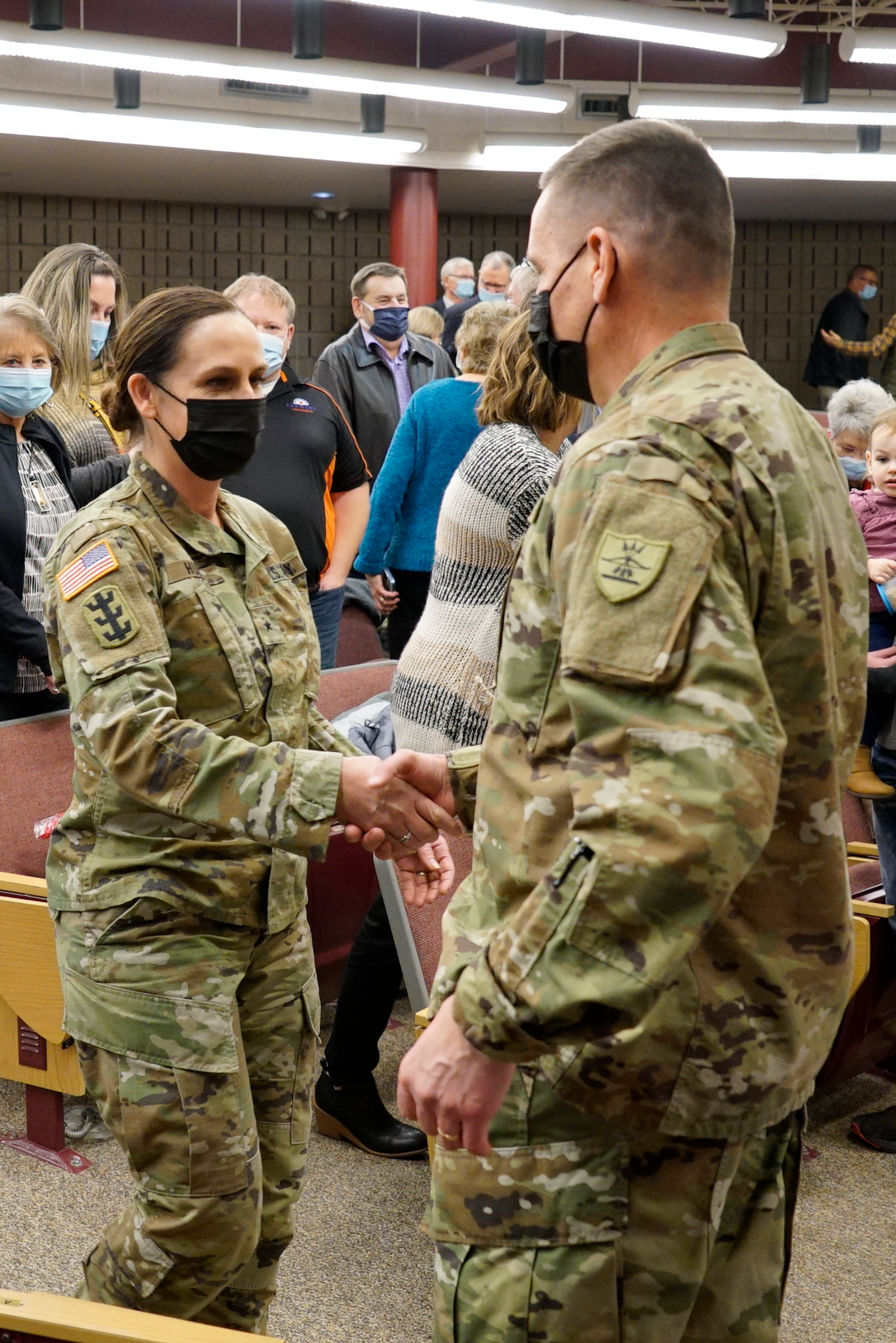 Top photo: Major General Al Dohrmann, N.D. adjutant general, applauds Jon Erickson moments after his promotion to brigadier general, Dec. 10, 2021, at the Raymond J. Bohn armory in Bismarck. (National Guard photo by Sgt. 1st Class Charles Highland, N.D. National Guard Public Affairs Office)