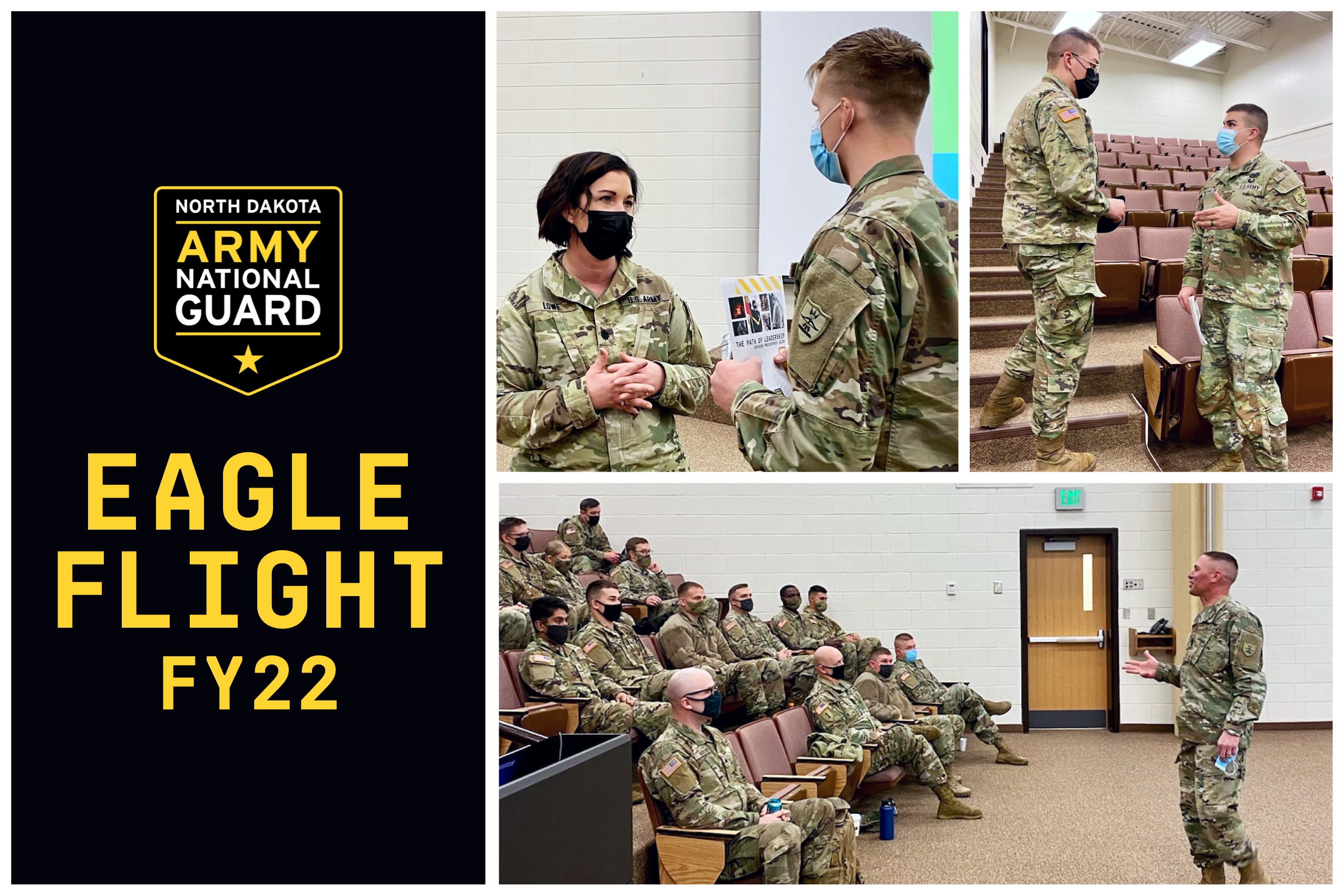Eagle Flight offers Soldiers the opportunity to learn about the different commissioning programs the N.D. Army National Guard has to offer. Options include Reserve Officers Training Corps (ROTC), Officer Candidate School (OCS), Warrant Officer Candidate School (WOCS), or direct commissions via specialty branches like Medical, Chaplain, and Judge Advocate General Corps.