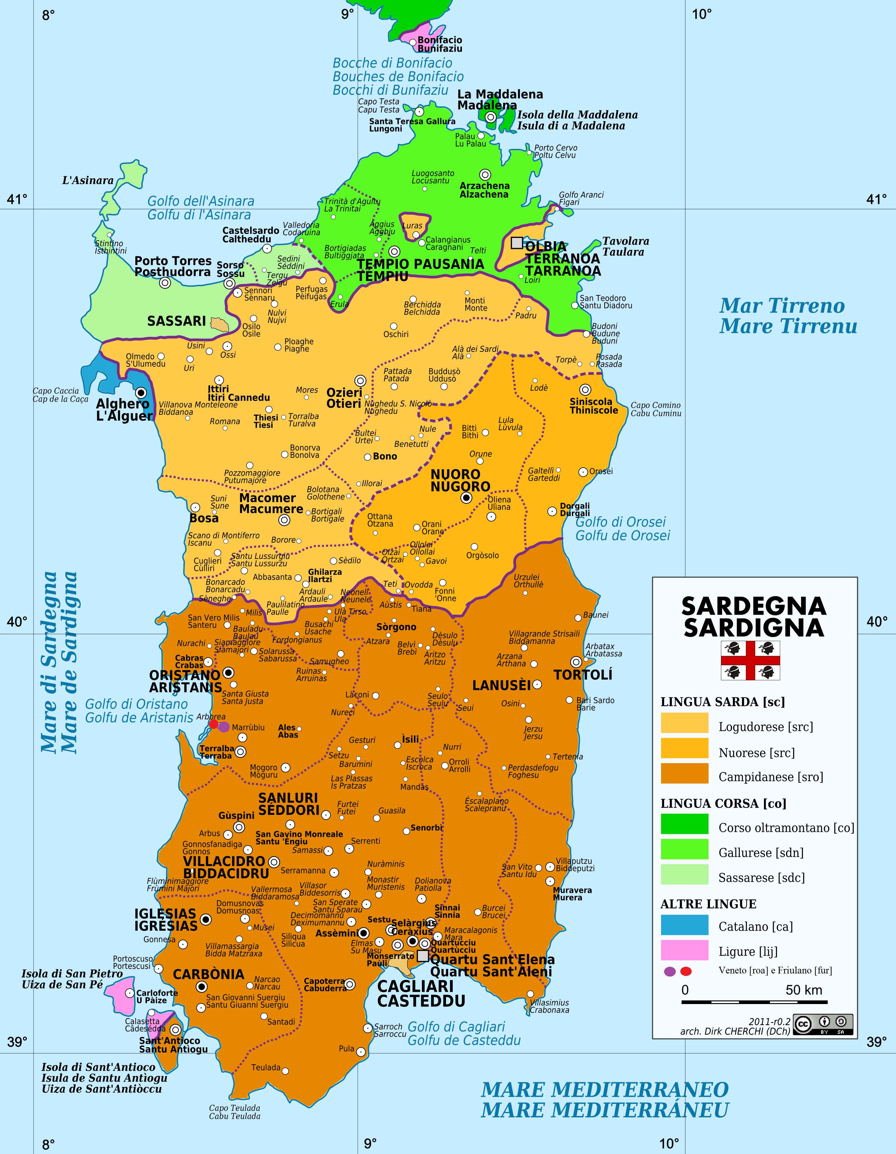 I confini geografici della lingua sarda non coincidono col profilo costiero dell’Isola, infatti in area settentrionale estrema sono in uso due dialetti di tipo italiano: il sassarese ad occidente e il gallurese ad oriente.