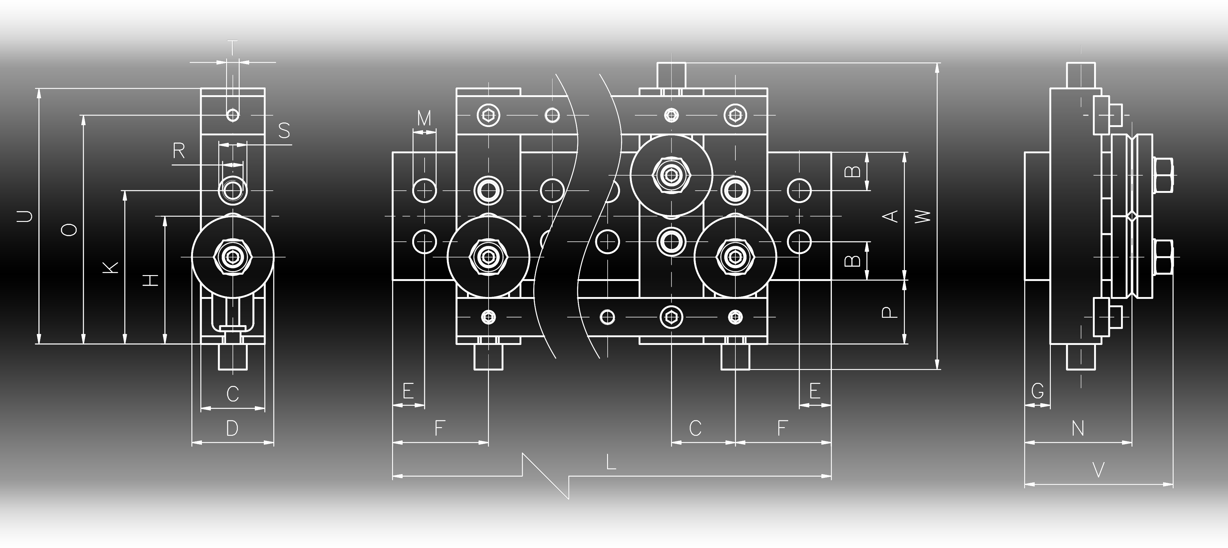 Le réglage radial et la fixation des axes des rouleaux sont possibles grâce aux trous oblongs percés dans le bâti du guidage et aux écrous hexagonaux associés. Comme pour la série de guidages RK VE.