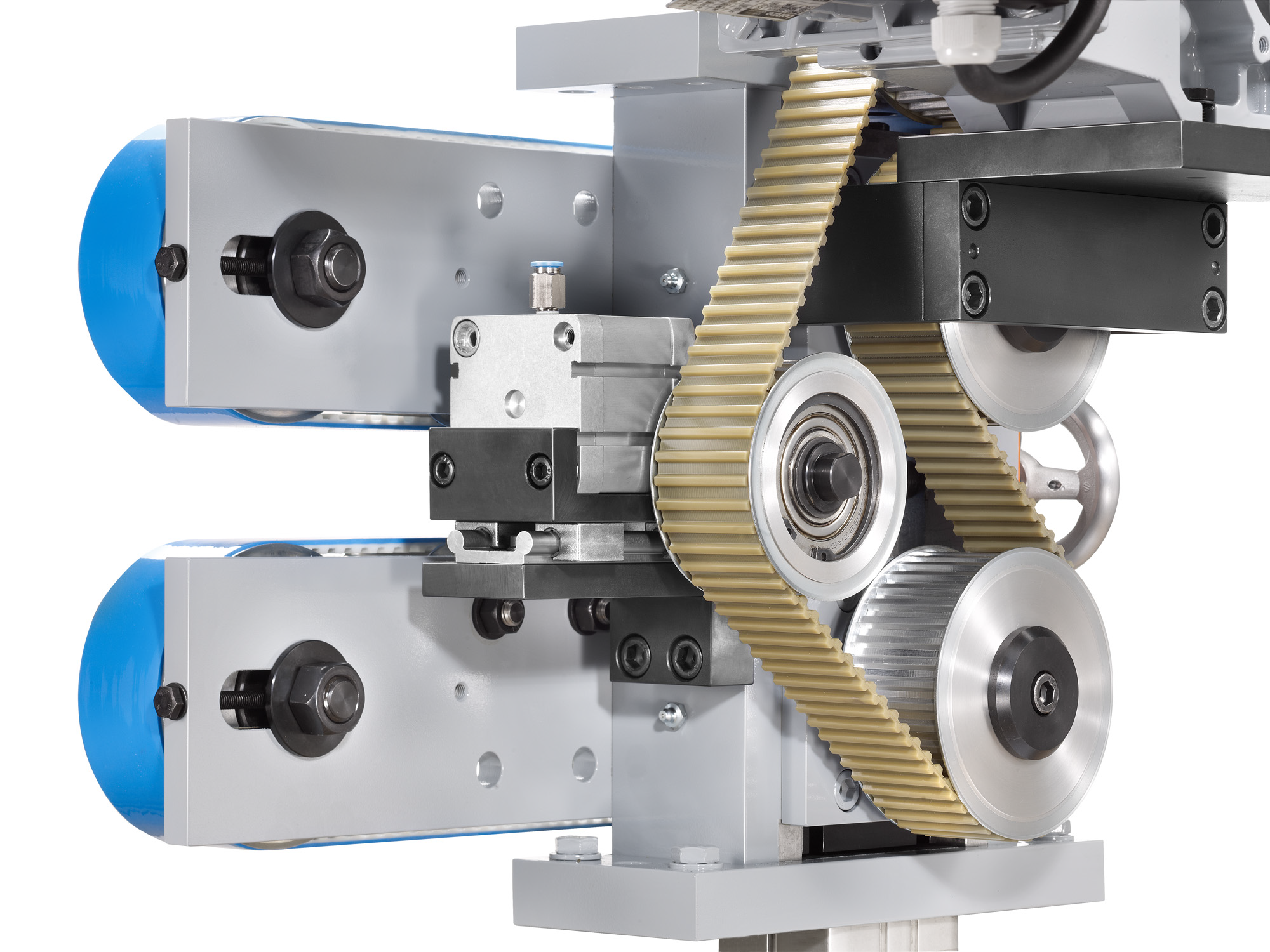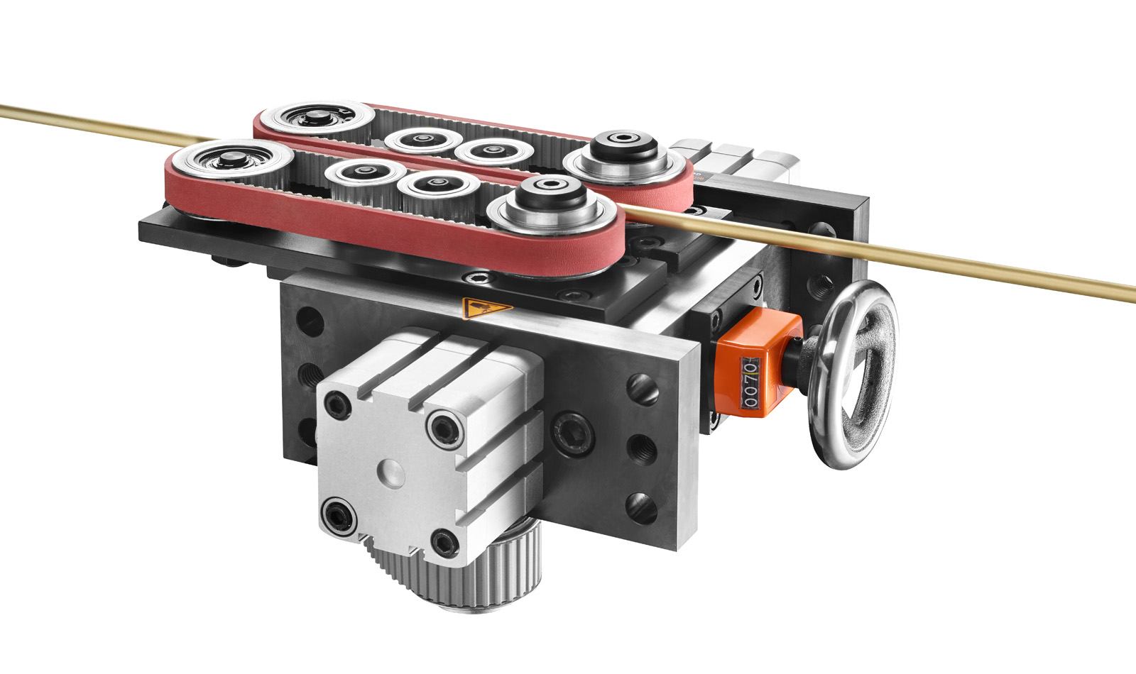 À pression de contact et couple donnés, les courroies génèrent une force d'entrainement plus élevée que les galets. Les chenilles de transport NAK 60 Z et NAK 160 Z utilisent des courroies de transport comme outils de serrage du produit à entrainer en douceur et de façon concentrique. En effet, chacune des deux courroies d’entrainement de l’unité d'amenage est disposée sur une pièce rainurée mobile qui peut être ajustée dans la direction du produit pour le serrer par l'intermédiaire d'un vérin pneumatique. Le réglage des pièces rainurées se fait manuellement, en position ouverte, par l'intermédiaire d'une cale, ce qui permet un réglage reproductible de la fente de transport au moyen d'un mécanisme à broche et d'un indicateur de position mécanique associé. Il est ainsi possible de serrer et d’entrainer différents diamètres ou sections symétriques avec des dimensions d'épaisseur comprises entre 0,6 mm et 15,0 mm ou entre 0,6 mm et 40,0 mm avec un alignement zéro défini et identique par rapport à l'équipement en amont et en aval.