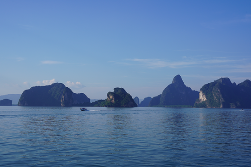 I took these photographs while on my honeymoon with my wife. The first five photos were taken in Phuket, Thailand. We visited John Gray’s Sea Canoe to see the natural sea caves. The first photo was taken from high up on the boat, looking down the front of the boat. I used the rule of thirds to capture the boat in the foreground, the sea in the middle ground, and the island in the background. I also used symmetry to highlight the front tip of the boat.