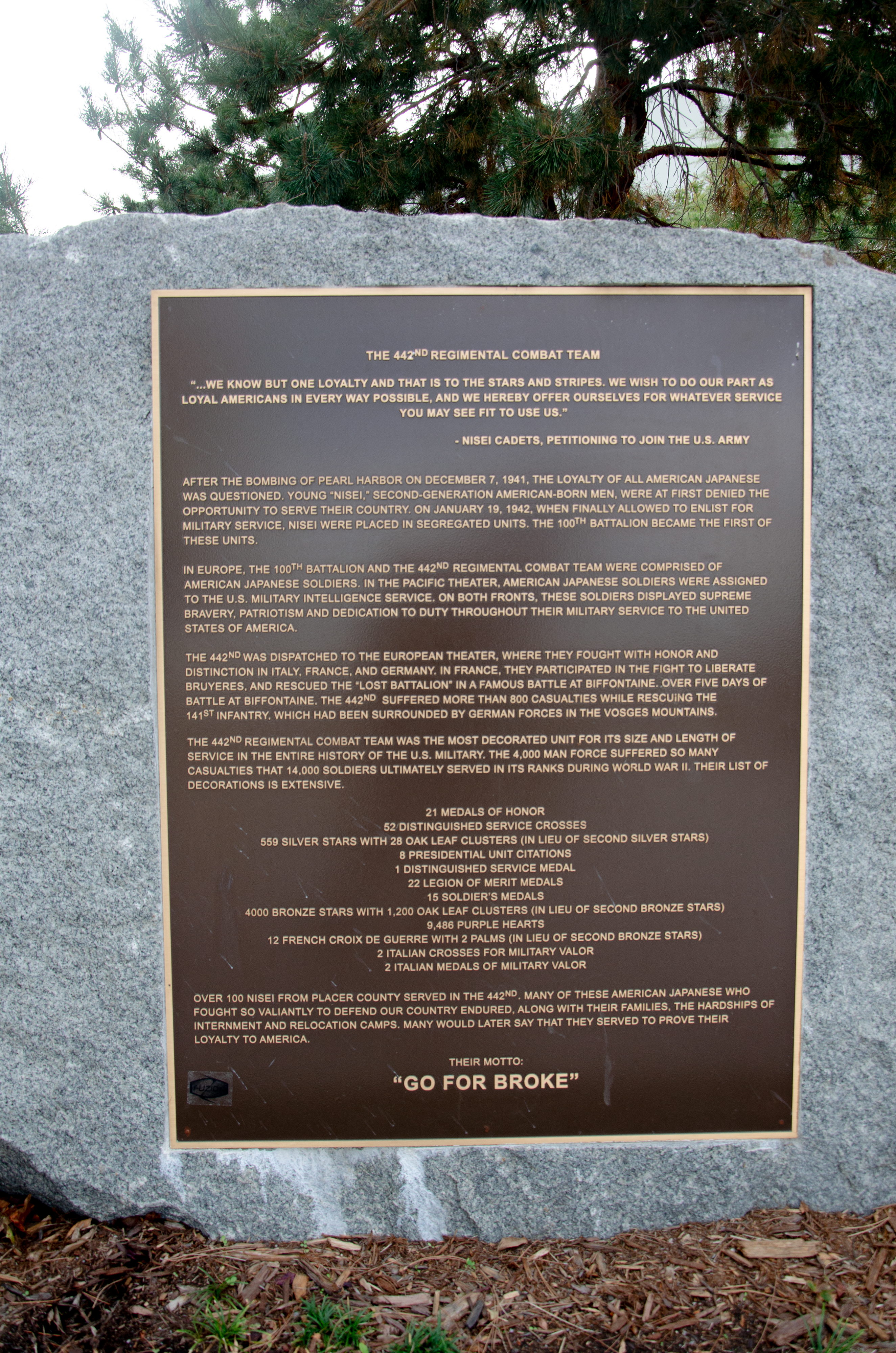 The memorial is dedicated to the brave Japanese-American soldiers of the 442nd RCT, 100th Battalion and Military Intelligence Service and their family members relocated in internment camps.
