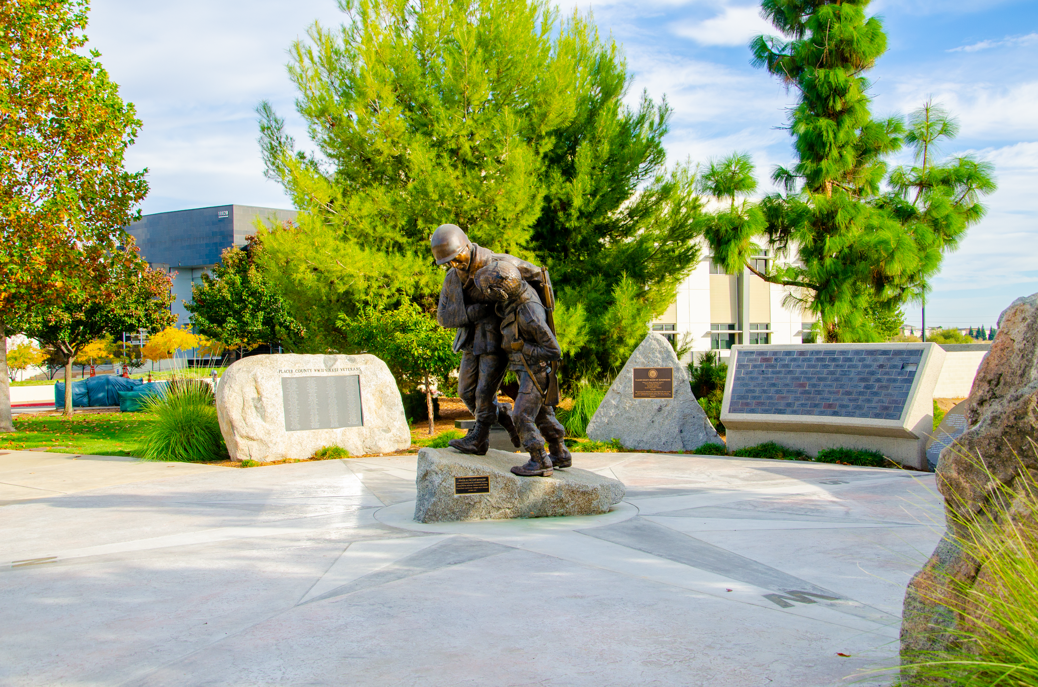 Located at the Bill Santucci Justice Center in Roseville, the bronze statue, “The Rescue of the Lost Battalion,” commemorates the heroic efforts of the 442nd Regimental Combat Team for their uncommon valor and sacrifice to rescue the 1st Battalion of the 141st Infantry Regiment, which were surrounded by enemy forces during World War II.