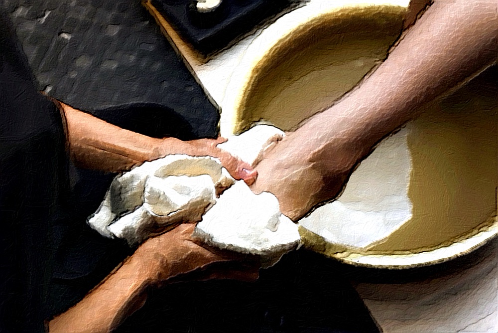 Jesus girded himself and washes the disciples feet, telling them to do so also to each other. This is the work and service that we must do bowing to each other and helping our brothers to also enter into the kingdom of heaven.
