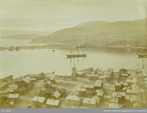 Før 1850 var Melkøya en del av gården Melkøysund. Her sett fra Hammerfest sentrum. Foto: Ukjent / Museene for kystkultur og gjenreisning i Finnmark IKS/ CC BY-NC-SA 4.0