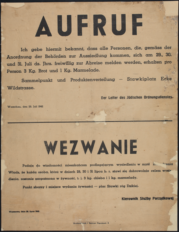 « En juillet 1942, les Allemands nous ont informés que nous serions bientôt « réinstallés » à l’est. Prétextant qu’il fallait vider les rues des sans-abri pour empêcher la propagation des maladies, ils ont d’abord sollicité des volontaires pour la relocalisation, leur offrant du pain et de la confiture en gage de « bonne foi ». (…) C’est ainsi que les policiers juifs ont commencé à convoyer les groupes d’habitants du centre du ghetto vers le terminus, déjà connu à l’époque sous l’appellation d’Umschlagplatz (place d’embarquement). Nous pouvions voir de longues charrettes à cheval remplies de volontaires, portant leur pain, leur confiture et leurs petits ballots d’effets personnels. Deux ou trois policiers juifs escortaient chaque charrette. Certains jeunes chantaient comme pour se prouver à eux-mêmes qu’avoir accepté l’offre des nazis leur permettrait d’améliorer leur vie, de la sauver même, et qu’ils s’embarquaient joyeusement dans cette aventure. » - Arthur Ney, L’Heure W