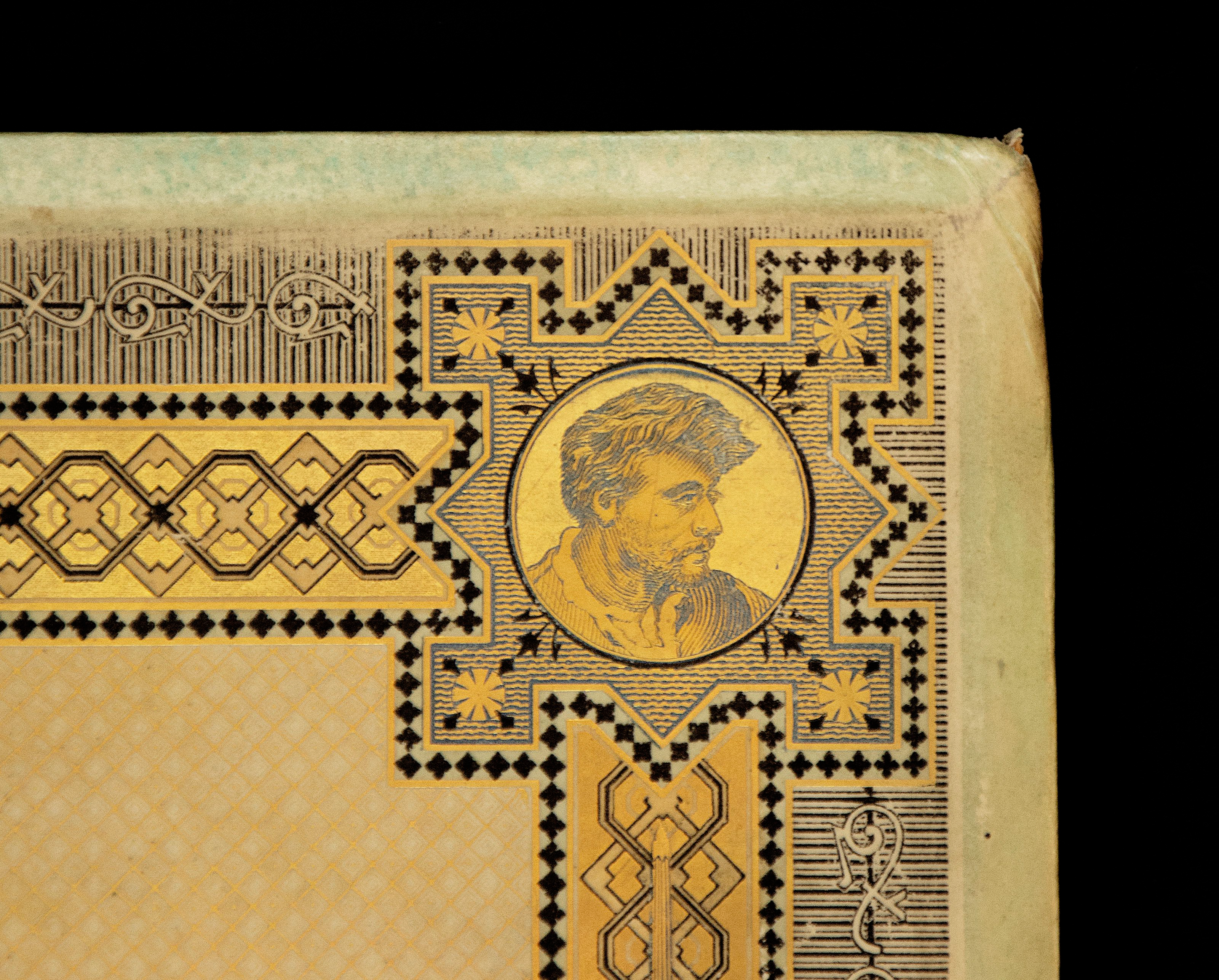 Esta edición parisina de principios del siglo XIX fue encuadernada en tela con varios elementos de decoración neoclásica: columnas griegas, grecas, hojas de acanto, guirnaldas de laurel y jarrones.