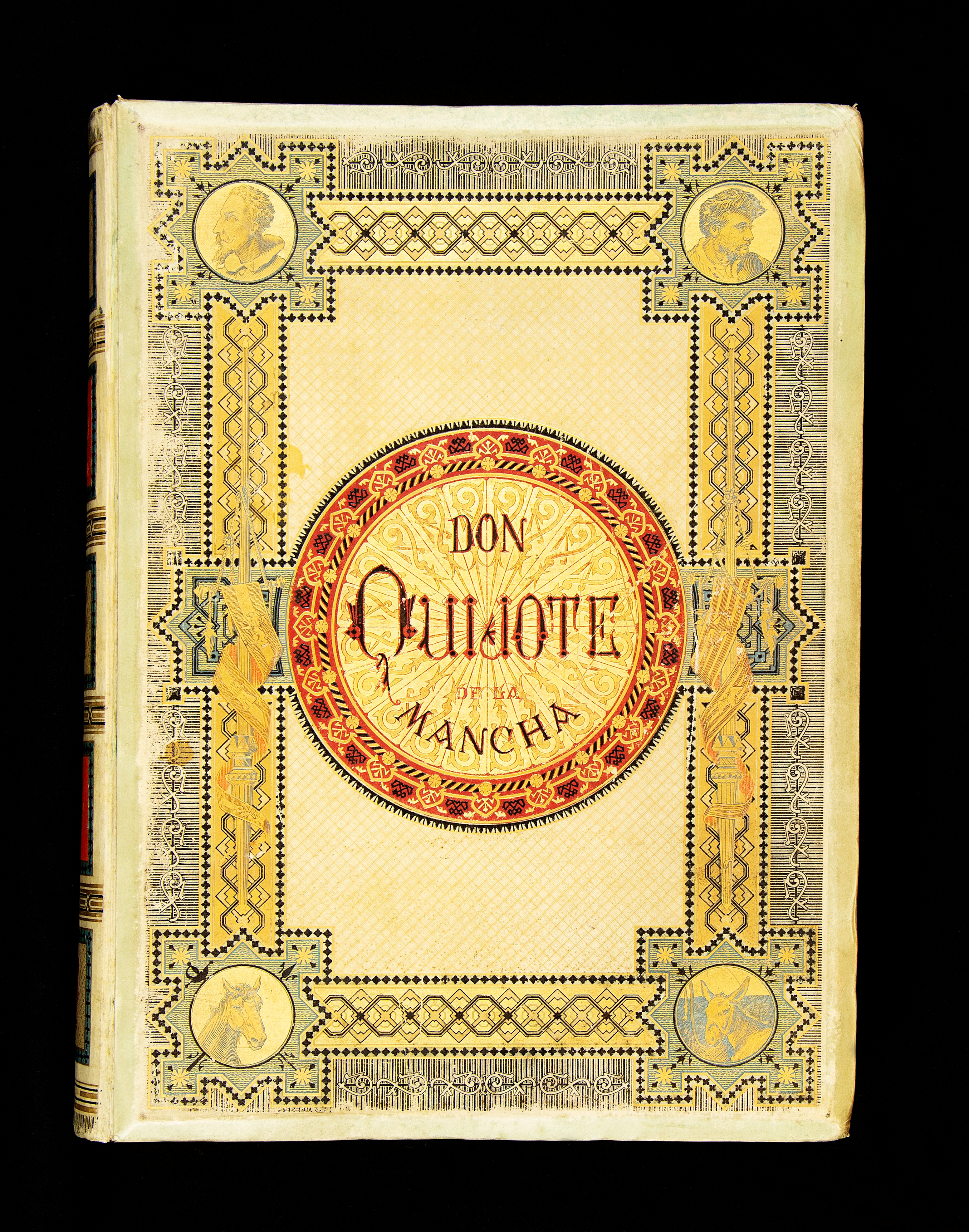 Esta edición parisina de principios del siglo XIX fue encuadernada en tela con varios elementos de decoración neoclásica: columnas griegas, grecas, hojas de acanto, guirnaldas de laurel y jarrones.