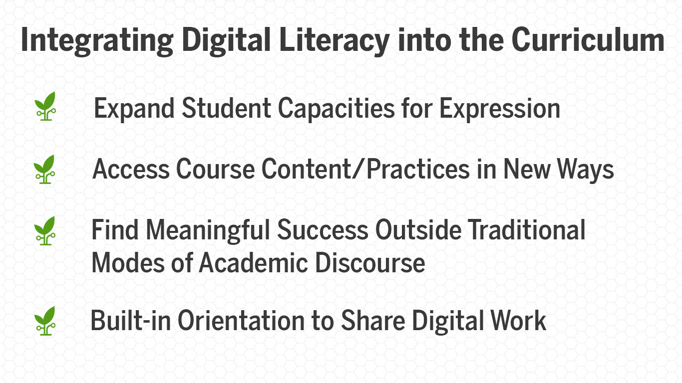 - When working in and across digital modalities, students can have meaningful success outside traditional modes of academic discourse. This is especially important for DEI efforts, including 1st gen, non-traditional, and international students, for many of whom traditional academic discourse can be a major hurdle if not insurmountable barrier.