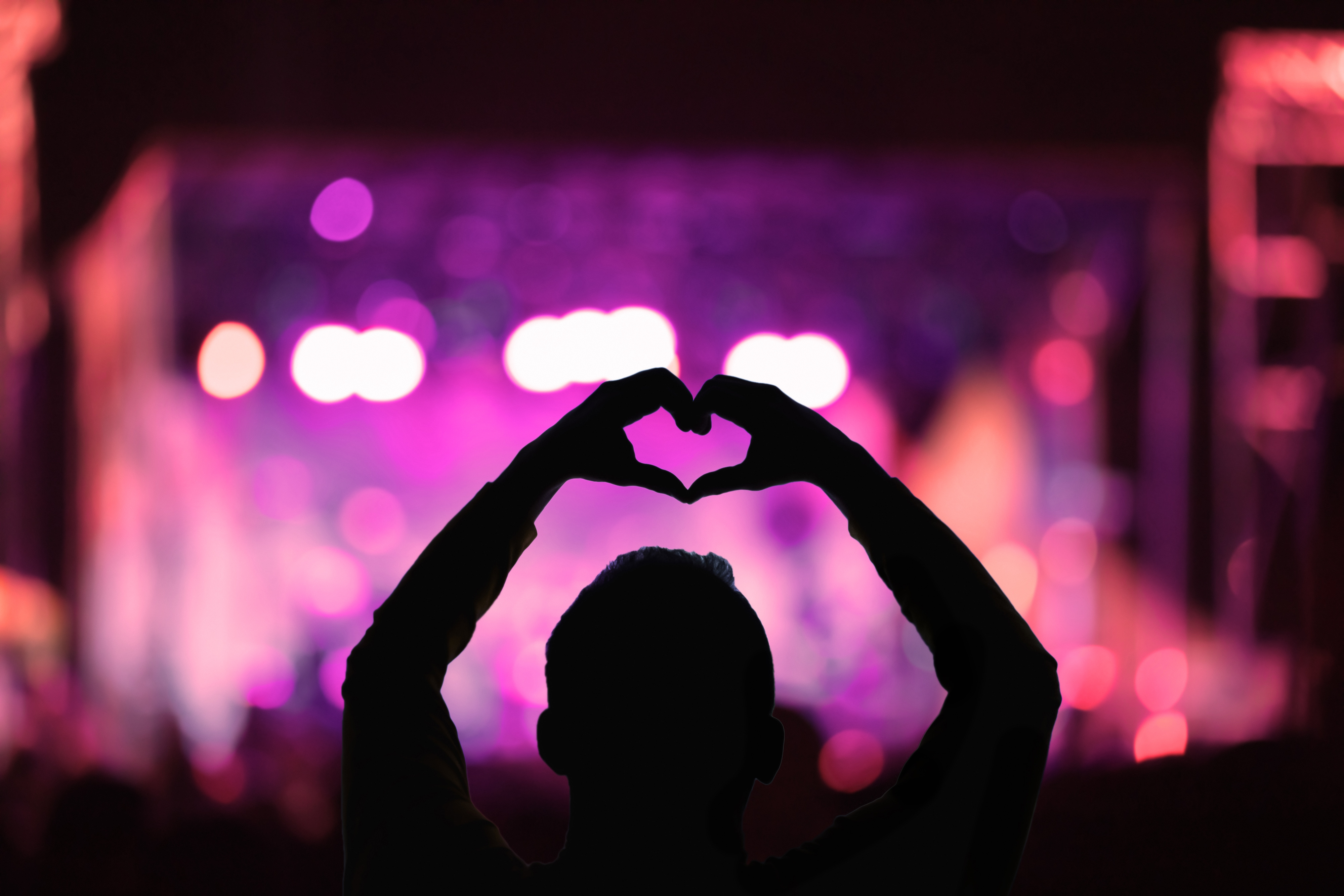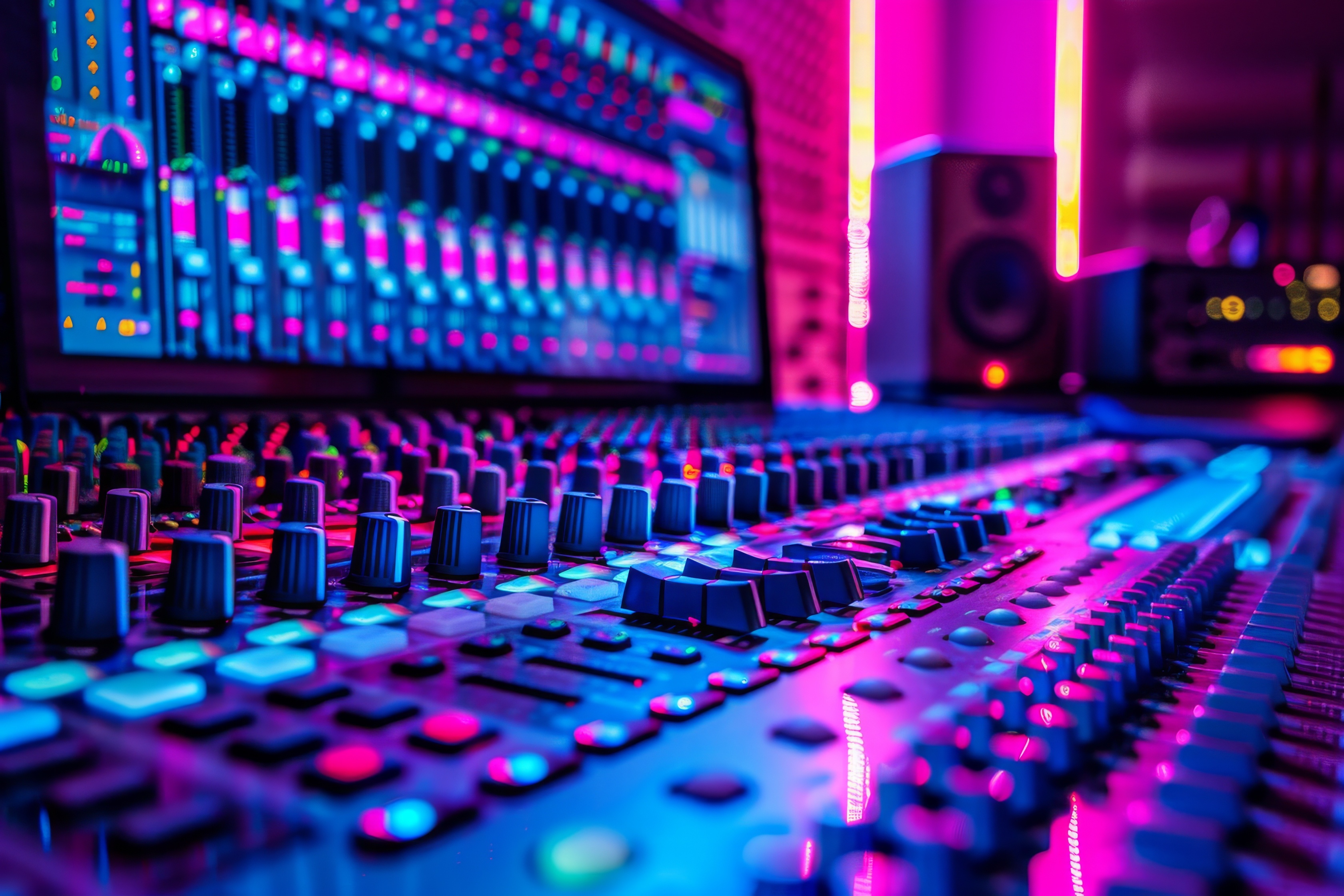 Created with images by Angelov - "row of stage lights, dark blue background, stage spotlights" • aarstudio - "Microphone on stage" • salajean - "Colorful purple stage lights" • karrastock - "Rock and roll live group" • itchaznong - "A computer monitor sits on a desk in front of a pair of speakers" • astrosystem - "Silhouette of a man with concert stage lights"