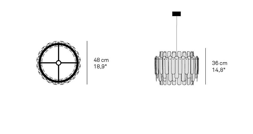 The do-it-yourself Maruja is packaged with all the components needed to assemble the lamp: wood veneer strips (in several sizes), a circular frame, and pins. Maruja is easily constructed, without the need for any tools or adhesives. Using a pin, each wooden strip is clipped onto the circular frame—insert a light bulb, and you will have created an elegant, handmade lamp. The wood veneer strips hang and move freely, and when illuminated, Maruja sparkles with life.