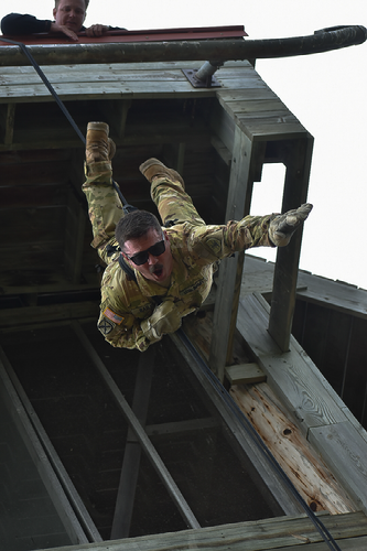 U.S. Army Chief Warrant Officer 2 Tim Bailey, Company D, 1st Battalion, 112th Aviation Regiment, tries his hand at a head-first rappel during annual training at Camp Grafton Training Center in Devils Lake, N.D., May 12. (National Guard photos by Spc. Nick Jessen, 1st Battalion, 112th Aviation Regiment)