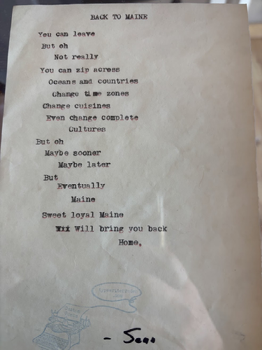 Shortly after I moved back to Maine after living abroad for 15 years, I was walking through the Saturday farmers market in Deering Oaks Park in Portland. A man was sitting at a small table with a typewriter with a sign that said “free poems”. I asked him for a poem about Maine and told him I had just moved back. Eight years later and it remains framed in my living room.