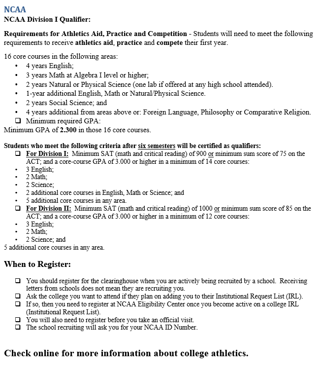 See Mrs. Milavickas or Mr. Washington for more information on NCAA and NAIA.