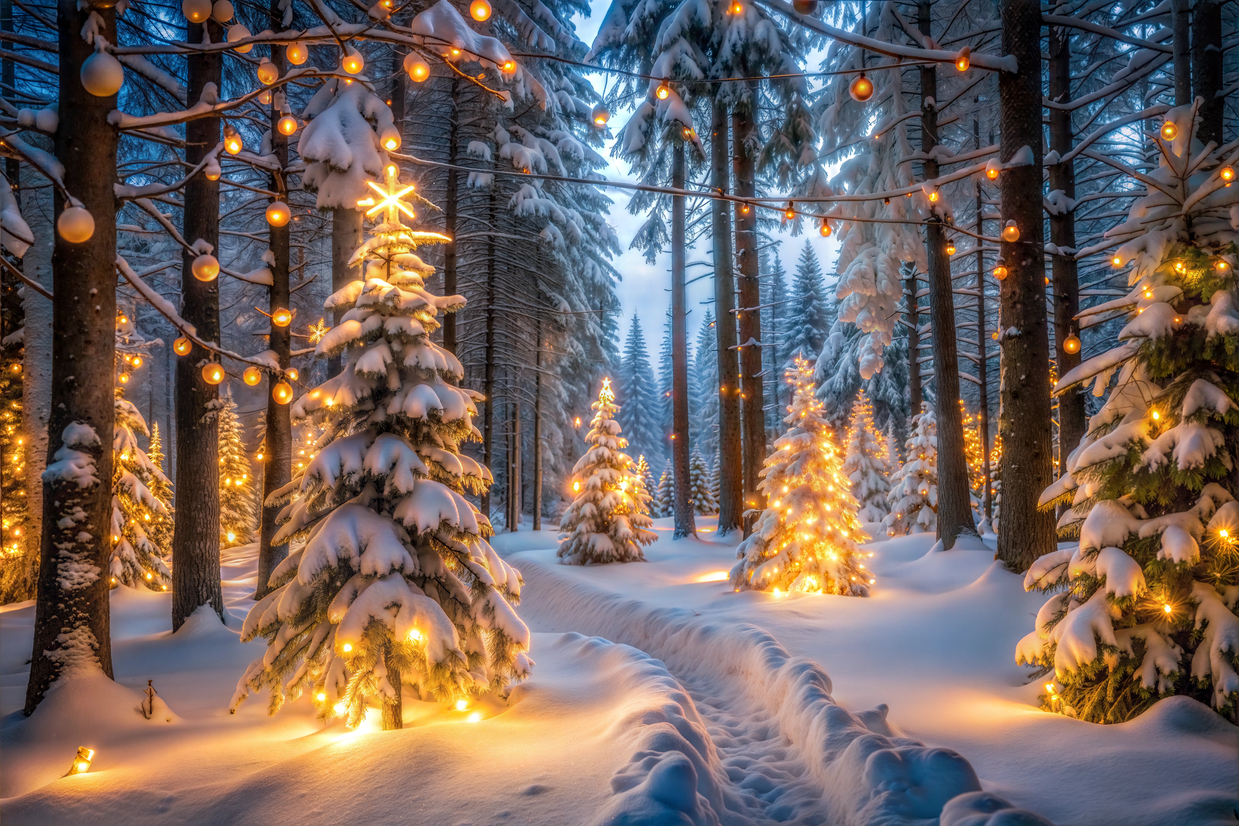 Created with images by Introvertia - "Magical winter wonderland with lit christmas trees in forest path at dusk" • Vitalii Shkurko - "A warm, cozy winter scene featuring lit candles and amber bottles on a windowsill with raindrops on the window." • Vadym - "Christmas and New Year celebration traditions, festive sweets, family culinary. Traditional gingerbread. Friends decorating freshly baked cookies with icing and mastic" • @foxfotoco - "Christmas and winter holiday marketing background, with winter and christmas tree themes, christmas ornaments and presents, snowy vibes." • Africa Studio - "Tasty breakfast with fried eggs, pancakes and bacon on plate" • javiindy - "Couple in a spinning class wearing sportswear."