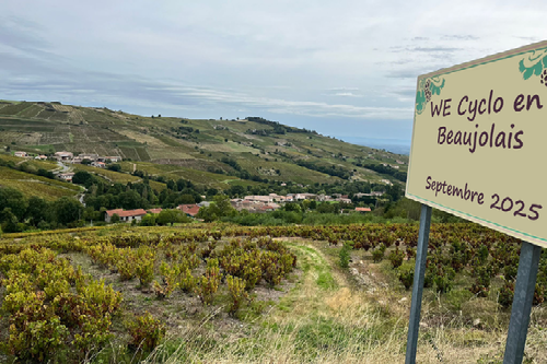 Nous sommes au km 41 à la sortie du village d' Odenas. On aperçoit au loin le mont Brouilly C'est ici que le groupe se sépare, deux parmi nous continueront en direction de Saint Lager, et le reste prendra la direction du Mont Brouilly. cette (Montée de 3,2 km et 238m de D+, une pente moyenne de 7,4 % et un passage max à 15%
