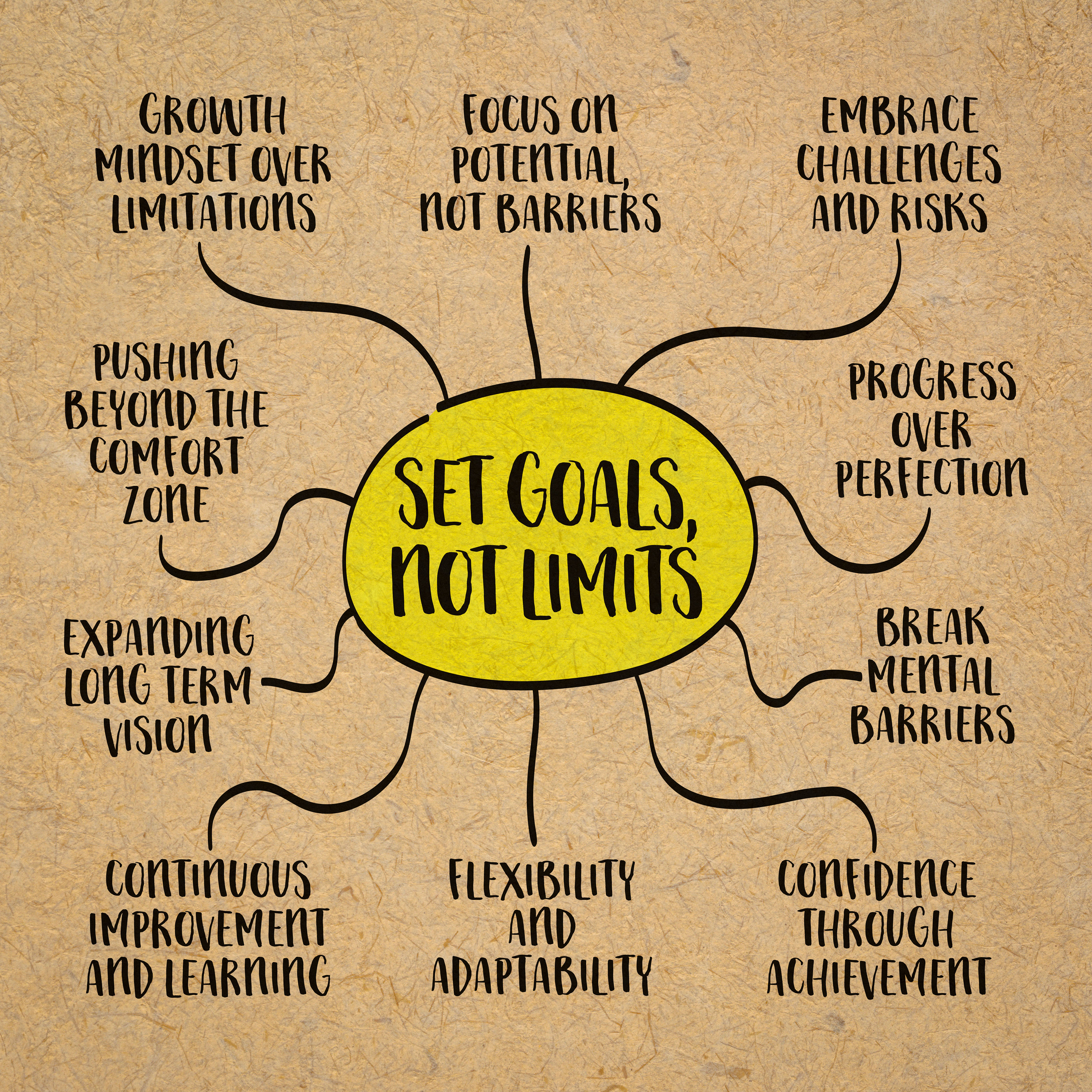 Created with images by tortoon - "Colorful pastel easter eggs on wooden background with space.,Vintage toned." • MarekPhotoDesign.com - "Set goals, not limits, the concept encourages a mindset of growth, potential, and possibility, mind map infographics."
