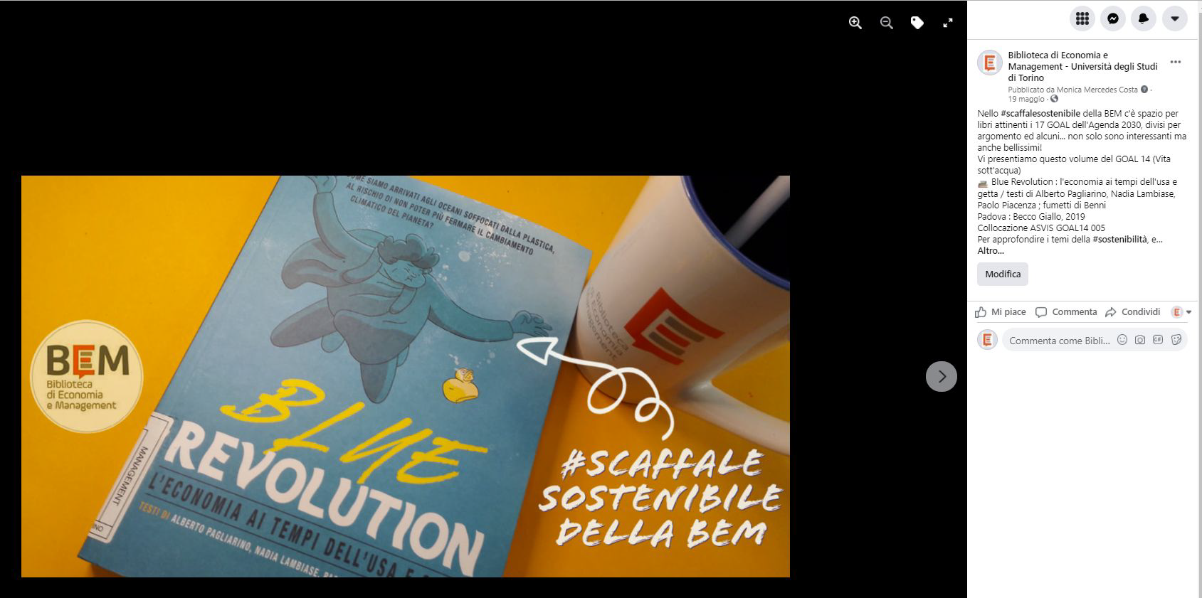 Questa sezione è infatti completamente dedicata ai volumi a tema #Agenda2030: suddiviso in reparti per i diversi 17 GOAL lo #scaffalesostenibile viene continuamente incrementato. I testi acquistati vengono presentati anche sui social in maniera costante dando rilievo ai diversi target dei GOAL, anche quelli meno pertinenti le materie della Scuola di Management ed Economia.