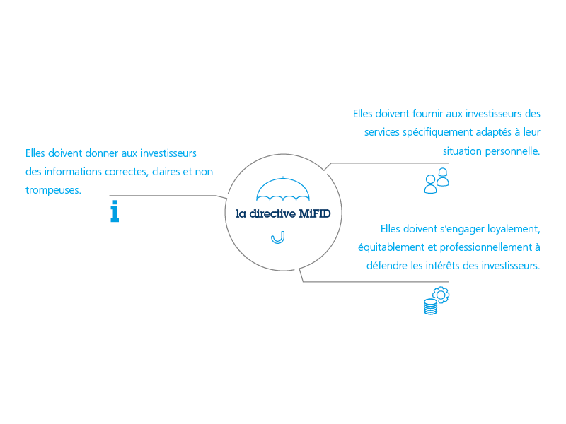 Tous les investisseurs n’ont pas les mêmes besoins. Un investisseur choisira de prendre davantage de risques dans l’espoir d’obtenir un rendement supérieur, tandis qu’un autre préfèrera jouer la carte de la sécurité et se satisfera d’un rendement inférieur. Entrée en vigueur le 1er novembre 2007, la directive MiFID (directive sur les marchés d’instruments financiers) vise à protéger les investisseurs. Cette directive européenne reprend trois principes fondamentaux que les entreprises doivent respecter lorsqu’elles conseillent des investisseurs :