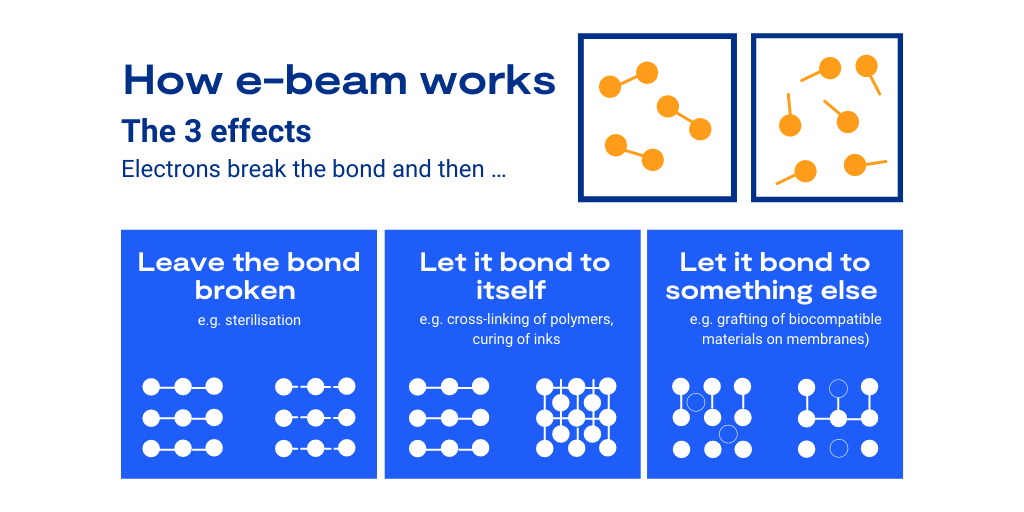 Ebeam processing works as the electron beam breaks chemical bonds within materials leading to three potential outcomes: