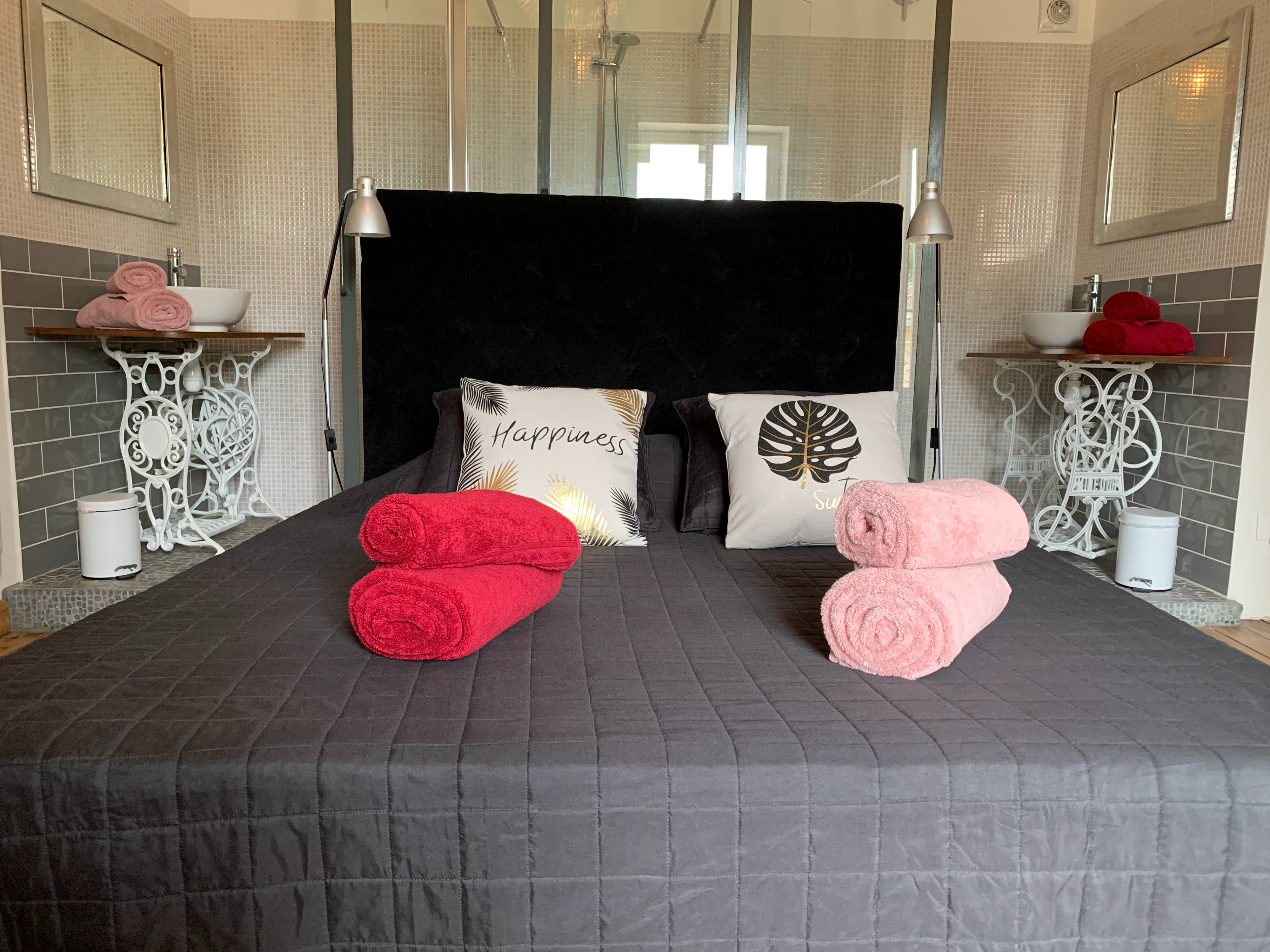 - Deux lavabos et sèche serviettes électrique avec une grande douche.