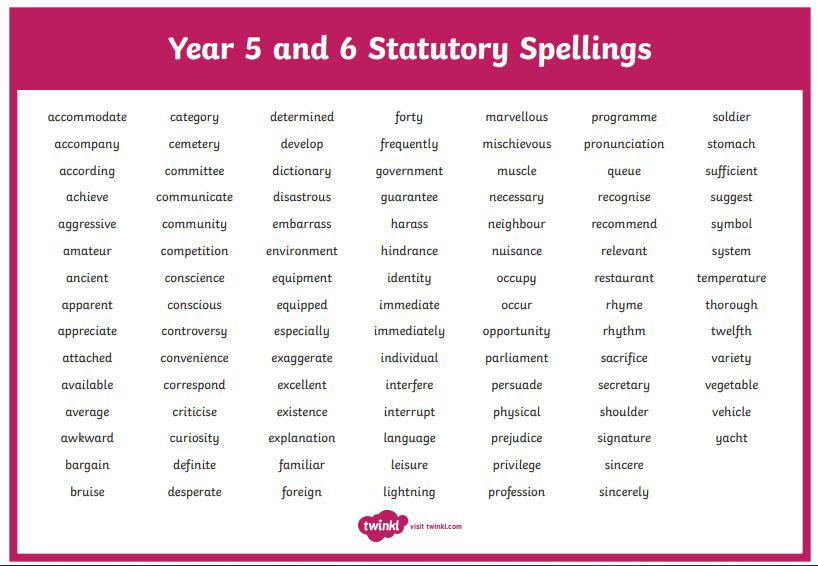 Each week your child will bring home a set of spellings to learn. This will include the week's spelling rule (usually related to phonics) and Statutory Words for Year 5 and 6.