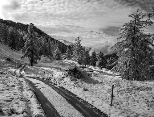 La nature semble surprise par les pemières neiges. Le vert du fond de vallée contraste avec le blanc. Les mélèzes sont encore parés de leur robe rouge