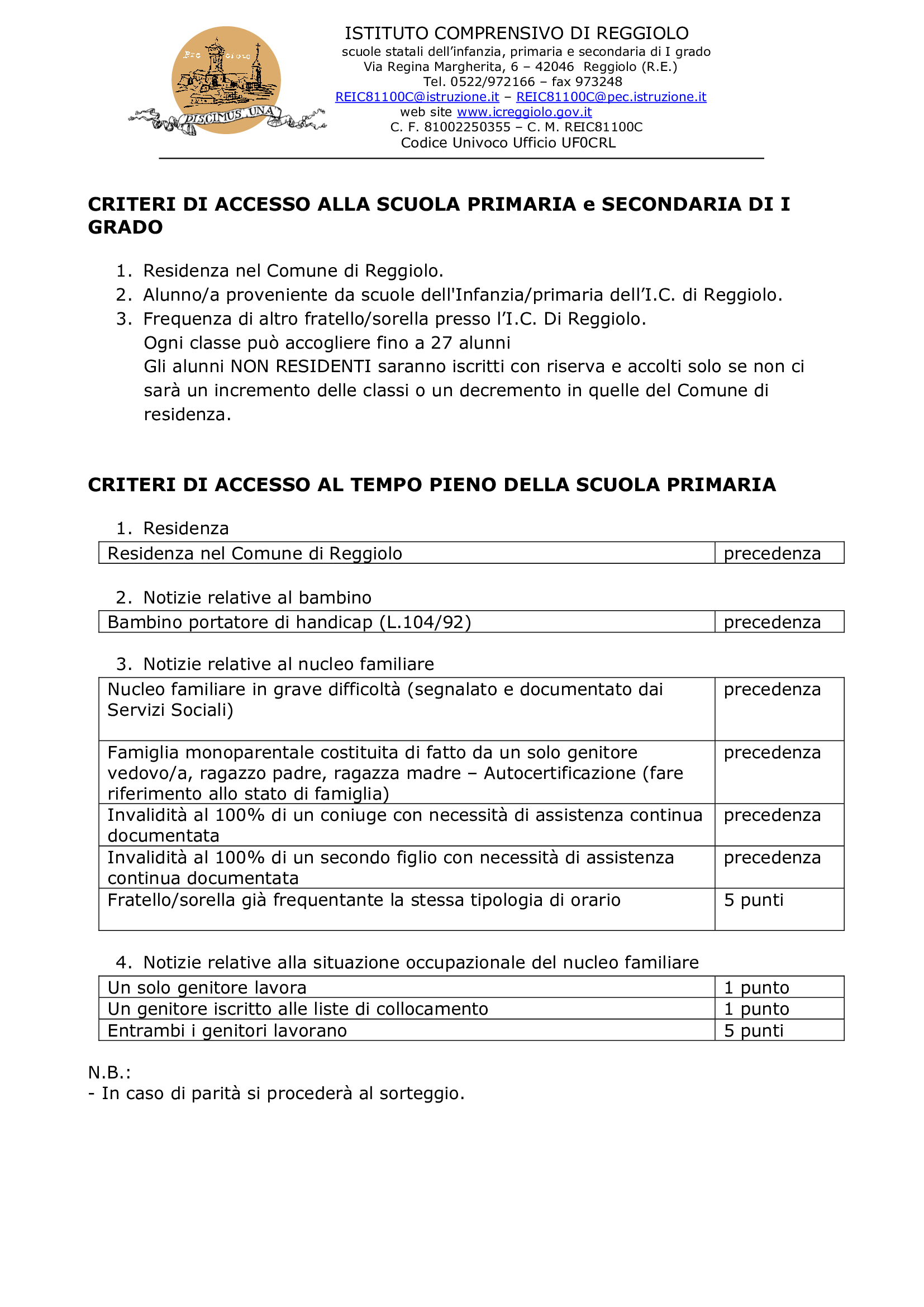 - Equilibrio numerico ( per sesso, per età in caso di anticipo, per provenienza, per particolari casi di situazioni difficili documentate).