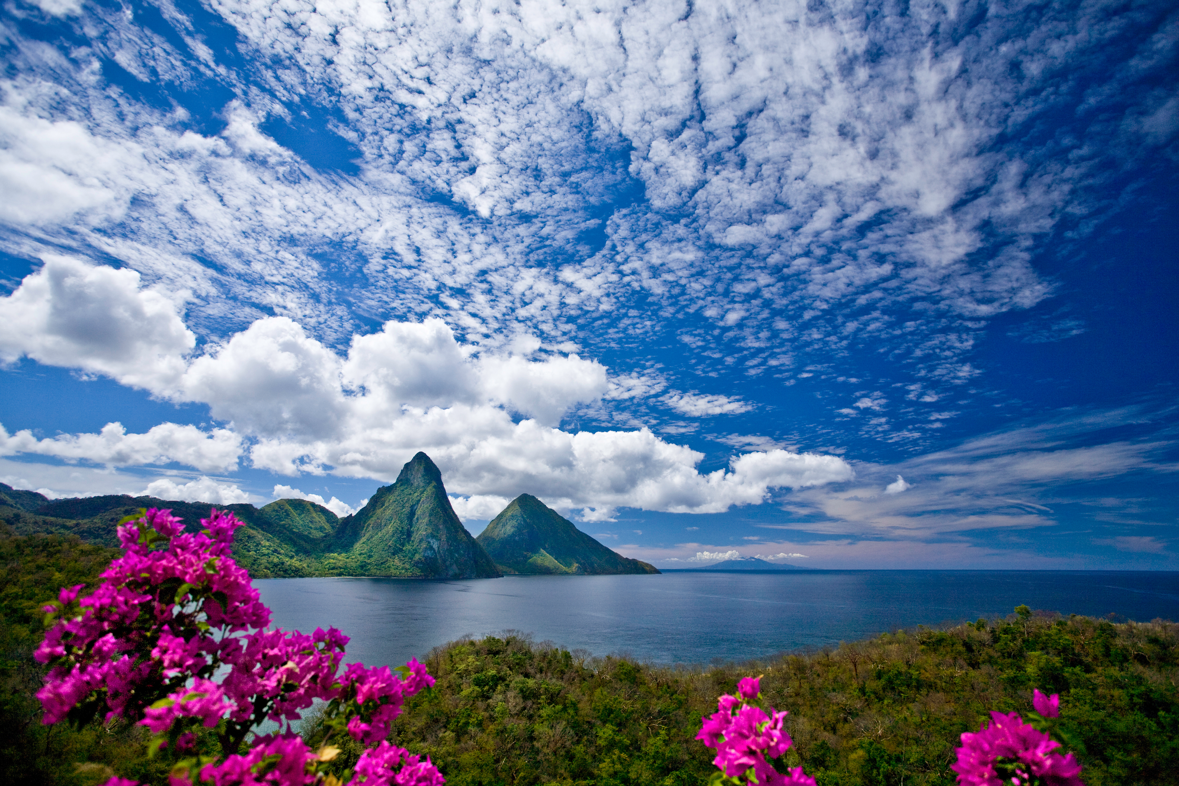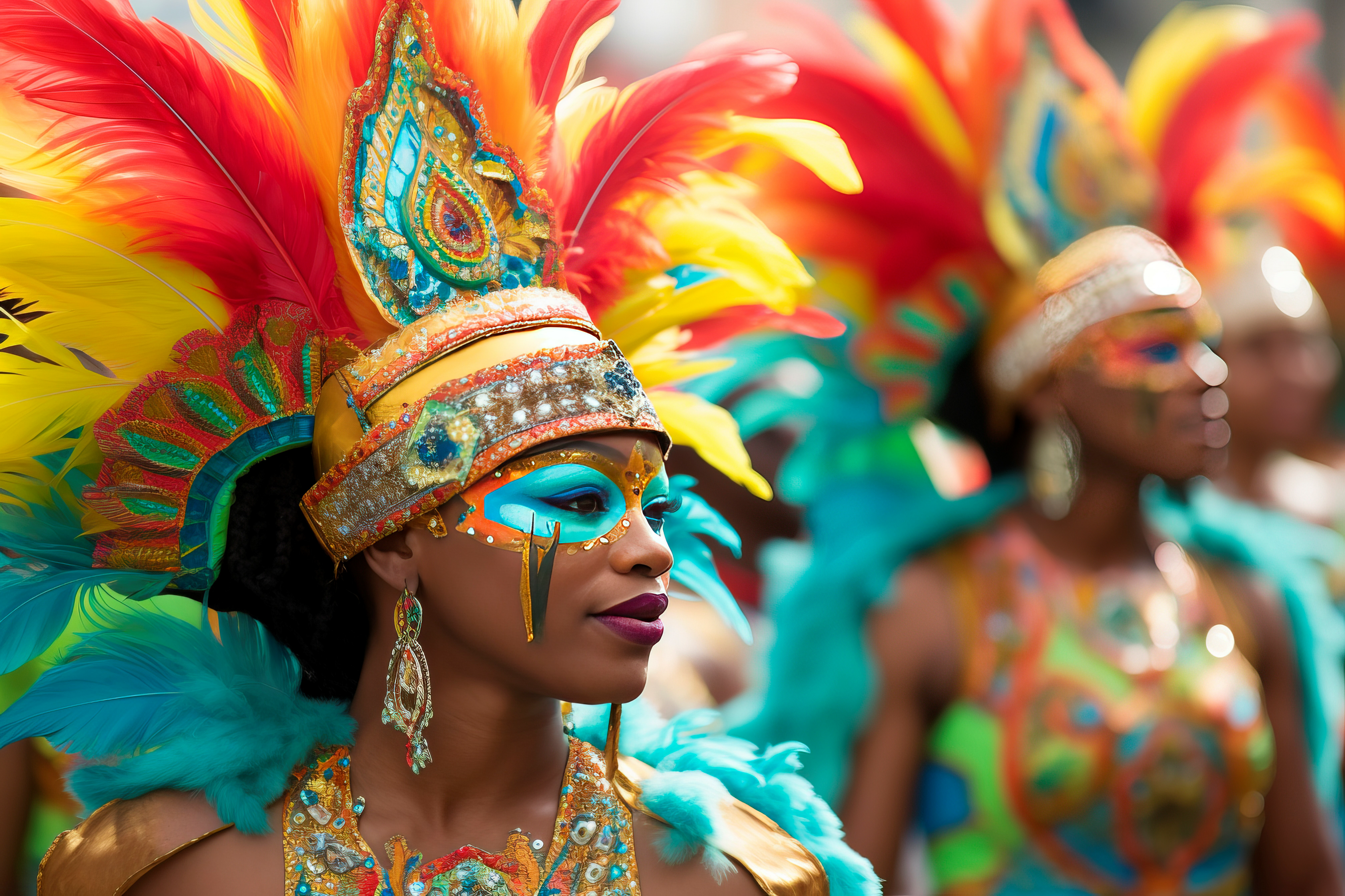 Created with images by brianluke - "Pitons, St. Lucia, Caribbean" โข nsit0108 - "Caribbean costume carnival street dance. Girl happy culture indian feathers. Generate Ai"