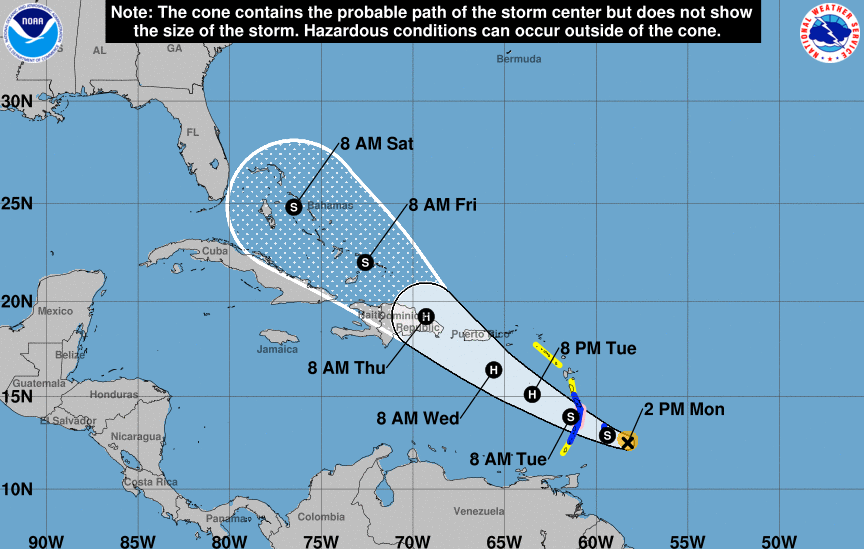The cone of uncertainty is often marked up with various symbols to help show a storm’s intensity (as seen in the image above). They are as follows:
