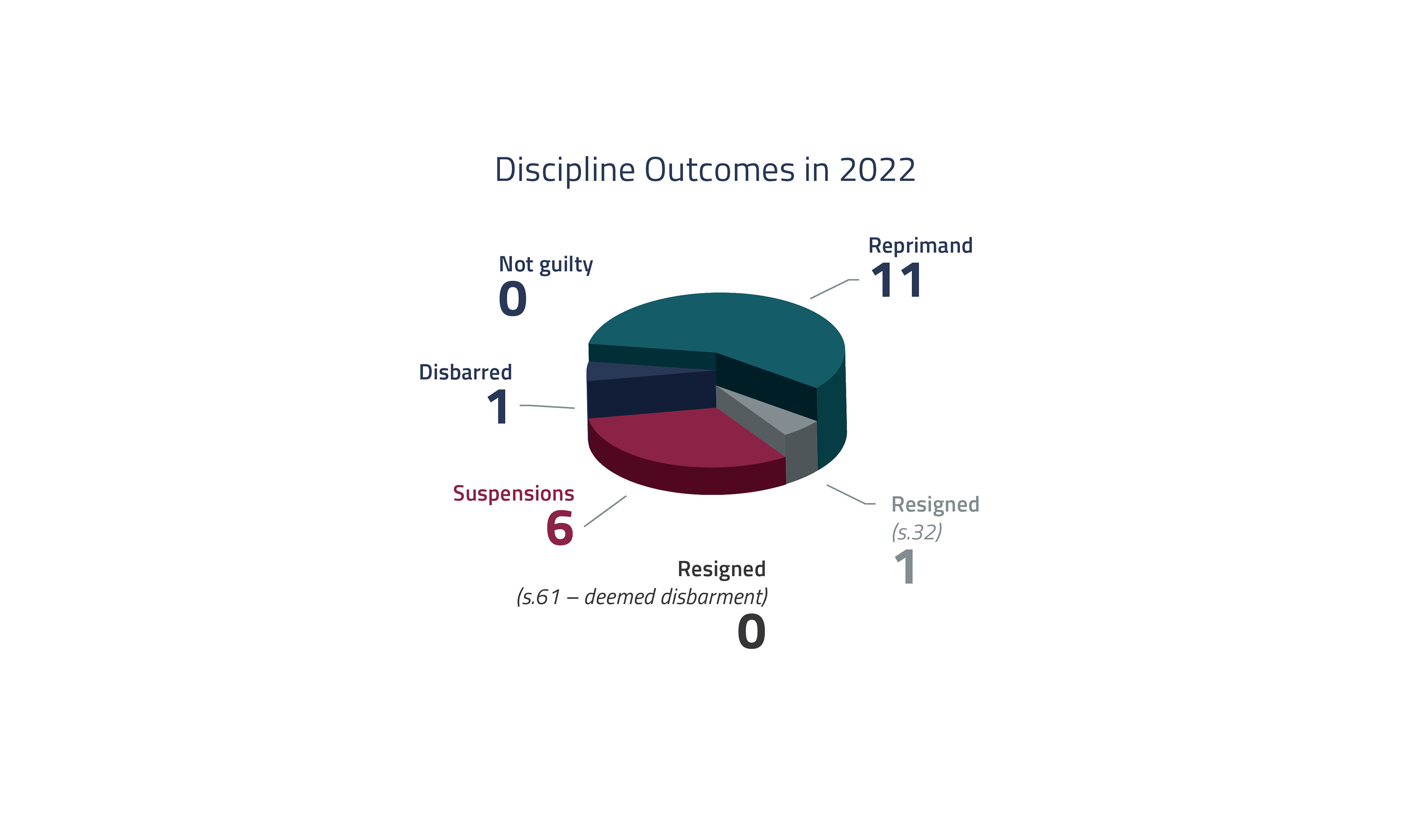 A combined total of 19 conduct and resignation hearings were concluded in 2022, with the following disciplinary outcomes: