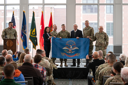 Lt. Governor Tammy Miller, center right, alongside Senator John Hoeven, left, Maj. Gen. Alan Dohrmann, second right, and Command Sgt. Maj. Jason Magnuson, right, present the United States flag to Capt. Nicholas P. Kindelspire, second left, and 1st Sgt. Michael H. Tavis, center left, both of the 188th Air Defense Artillery Regiment, during the Send-Off Ceremony of the 1-188th Air Defense Artillery Regiment, Bravo Battery at the University of North Dakota’s Memorial Union, Grand Forks, N.D., Sept. 16, 2023.